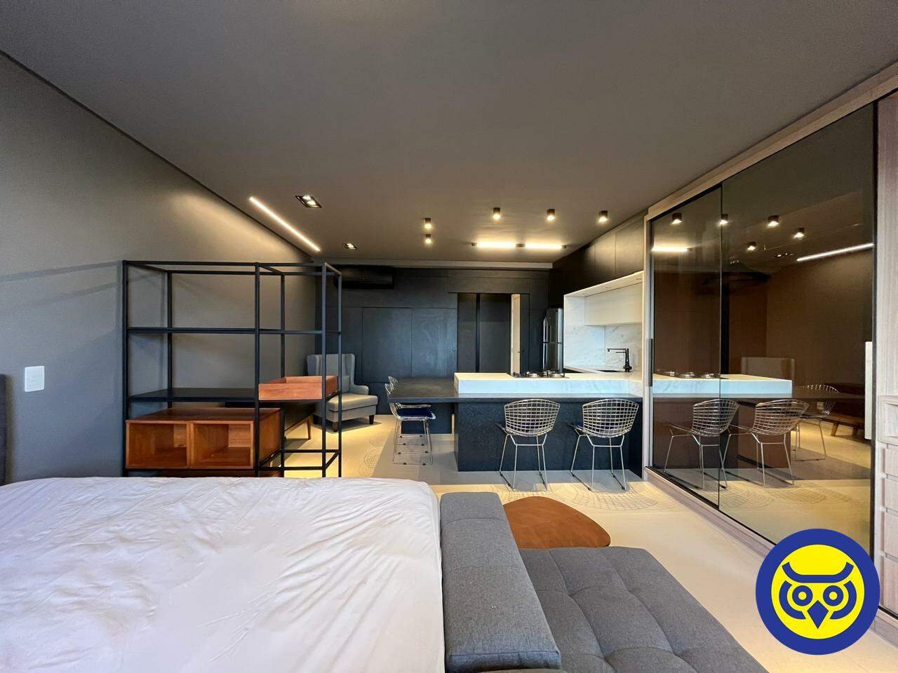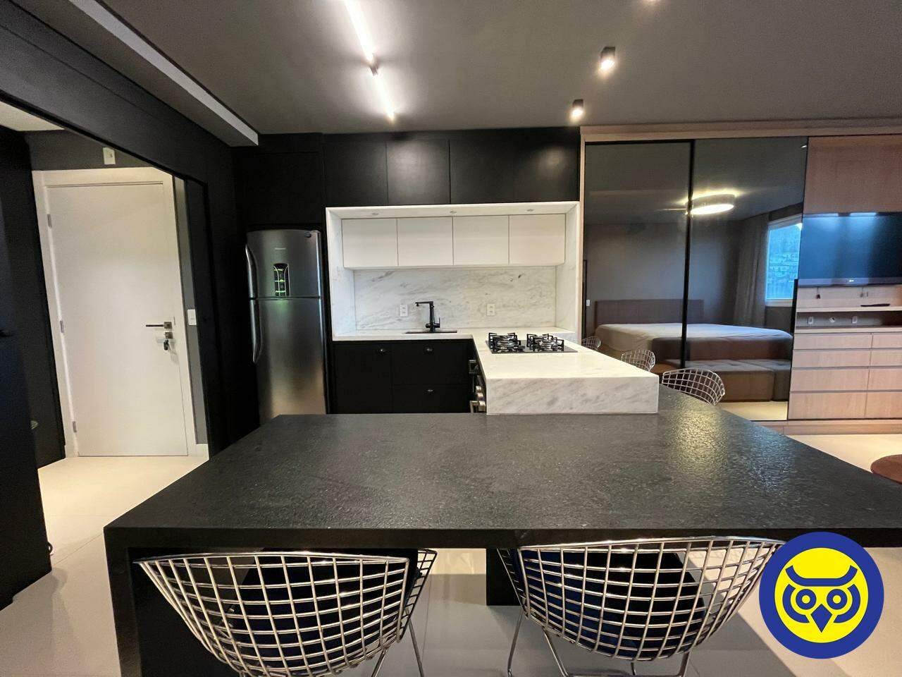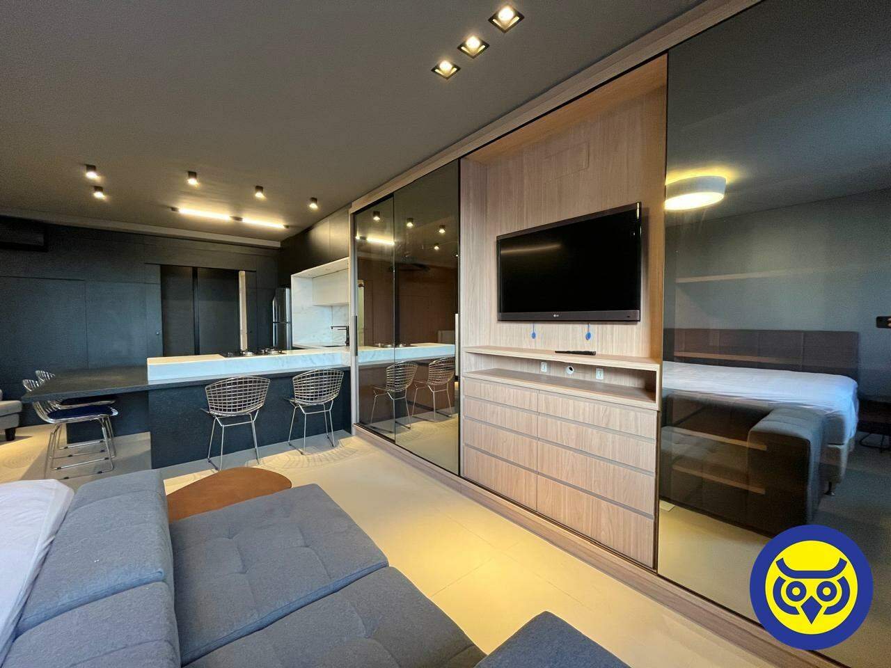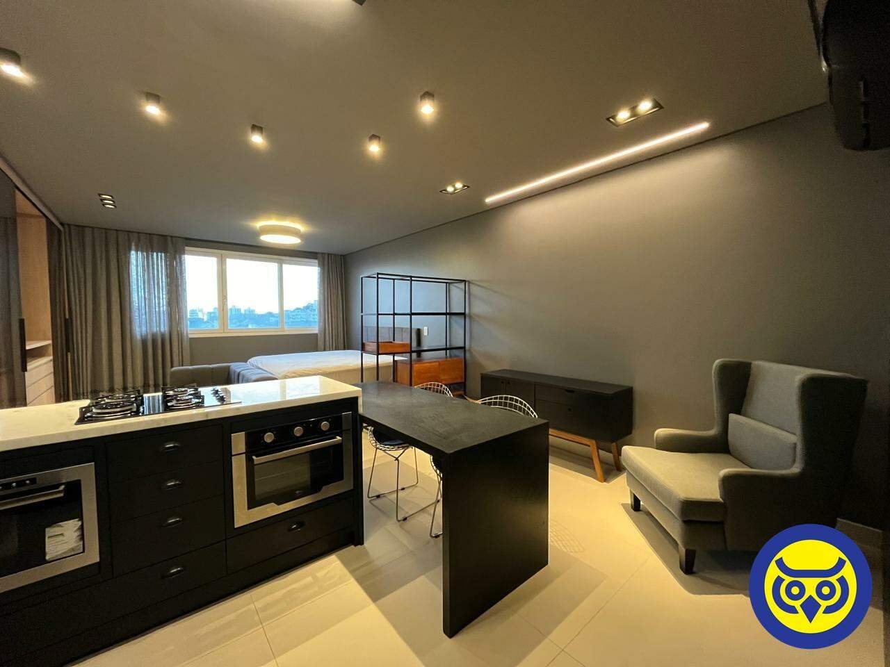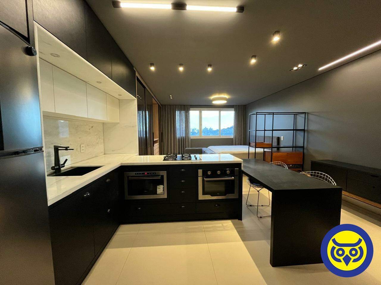 Studio totalmente mobiliado, com sala, quarto com armários, cozinha planejada, área de serviço e 1 vaga de garagem.