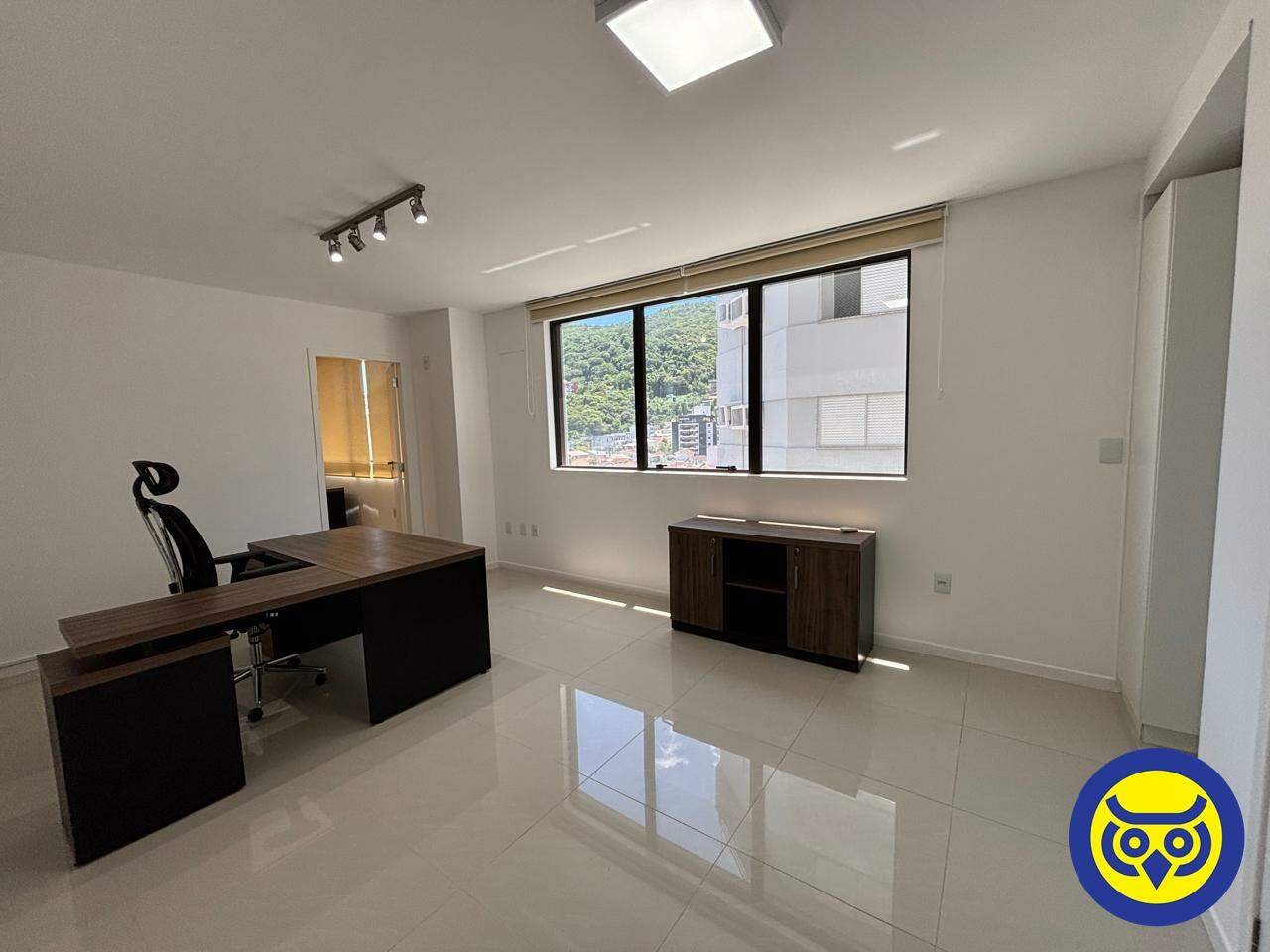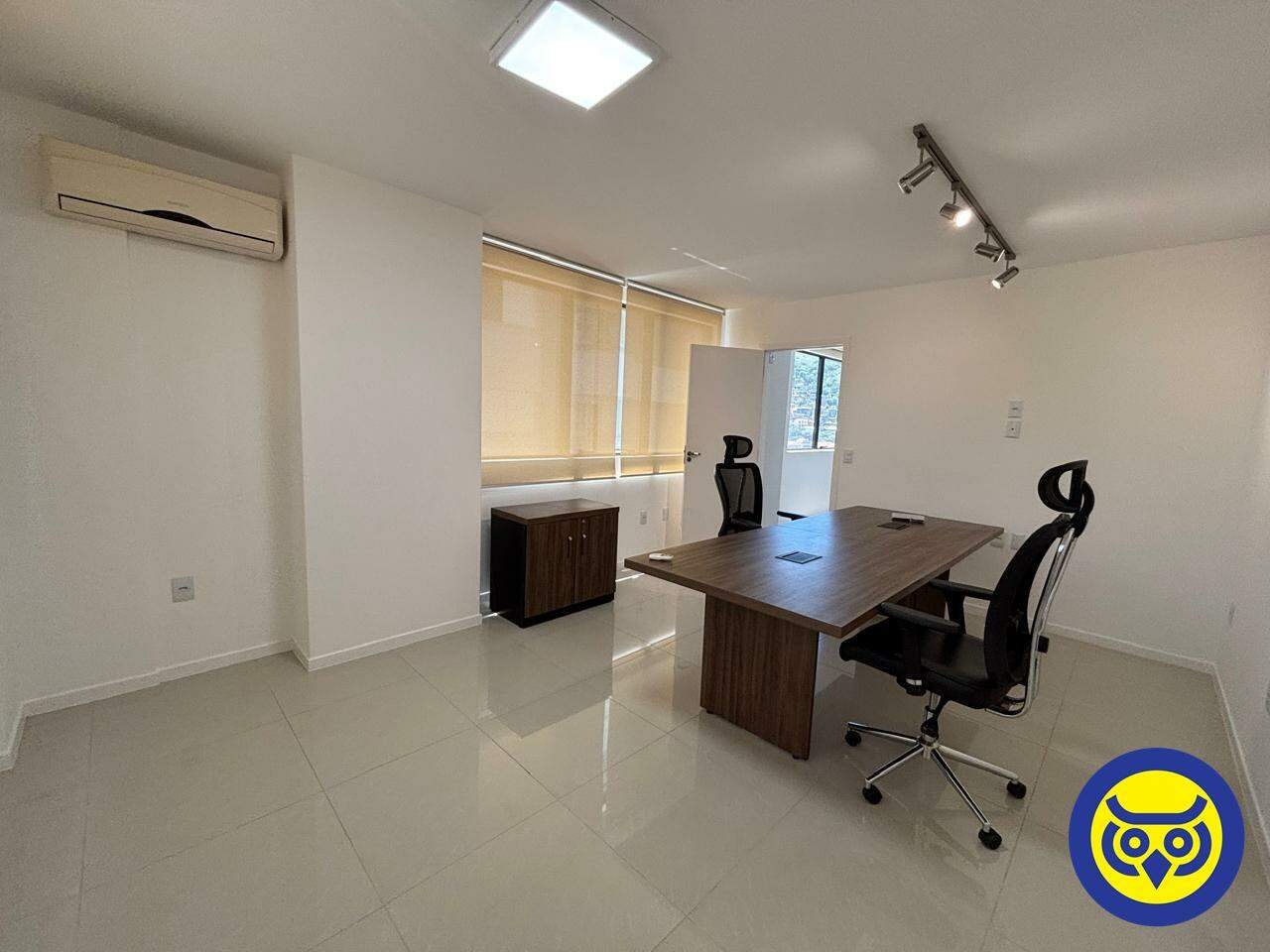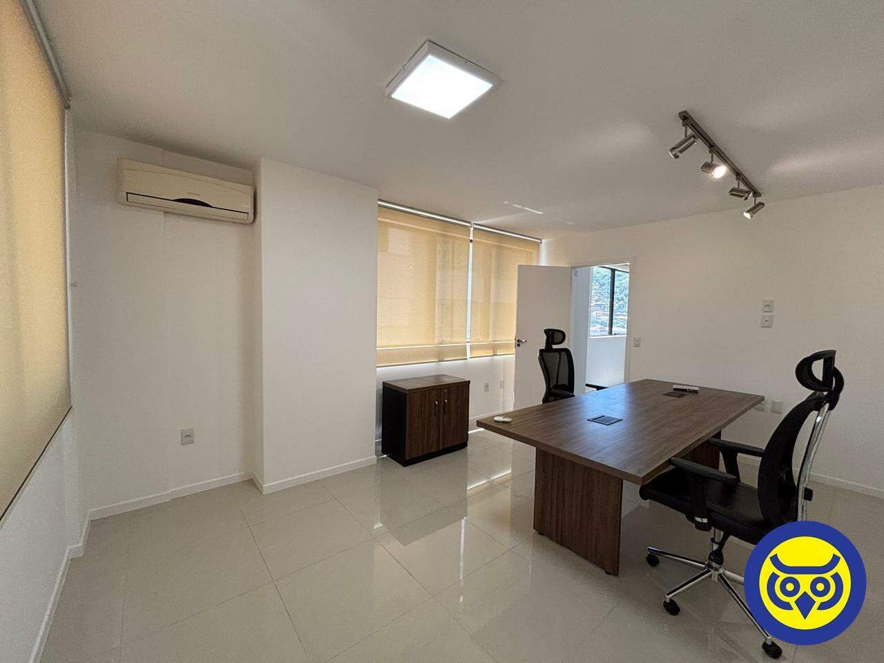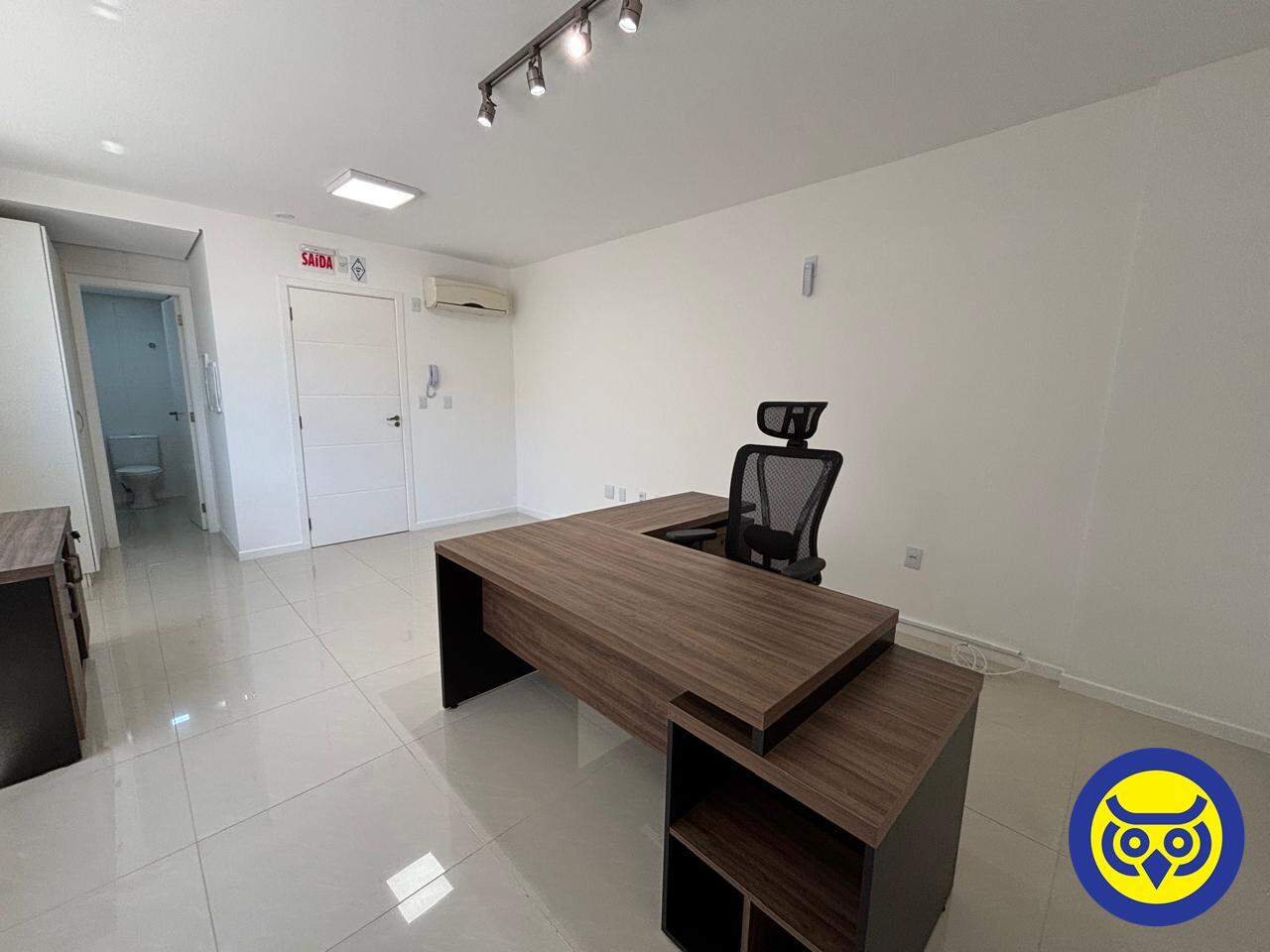 Sala comercial mobiliada para locação no bairro Centro, em Florianópolis, com 2 ambientes, 1 banheiro e 1 vaga de garagem. Possui hidrômetro individual e espera para split.