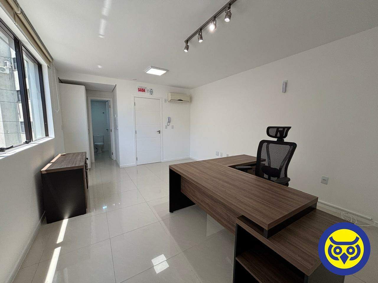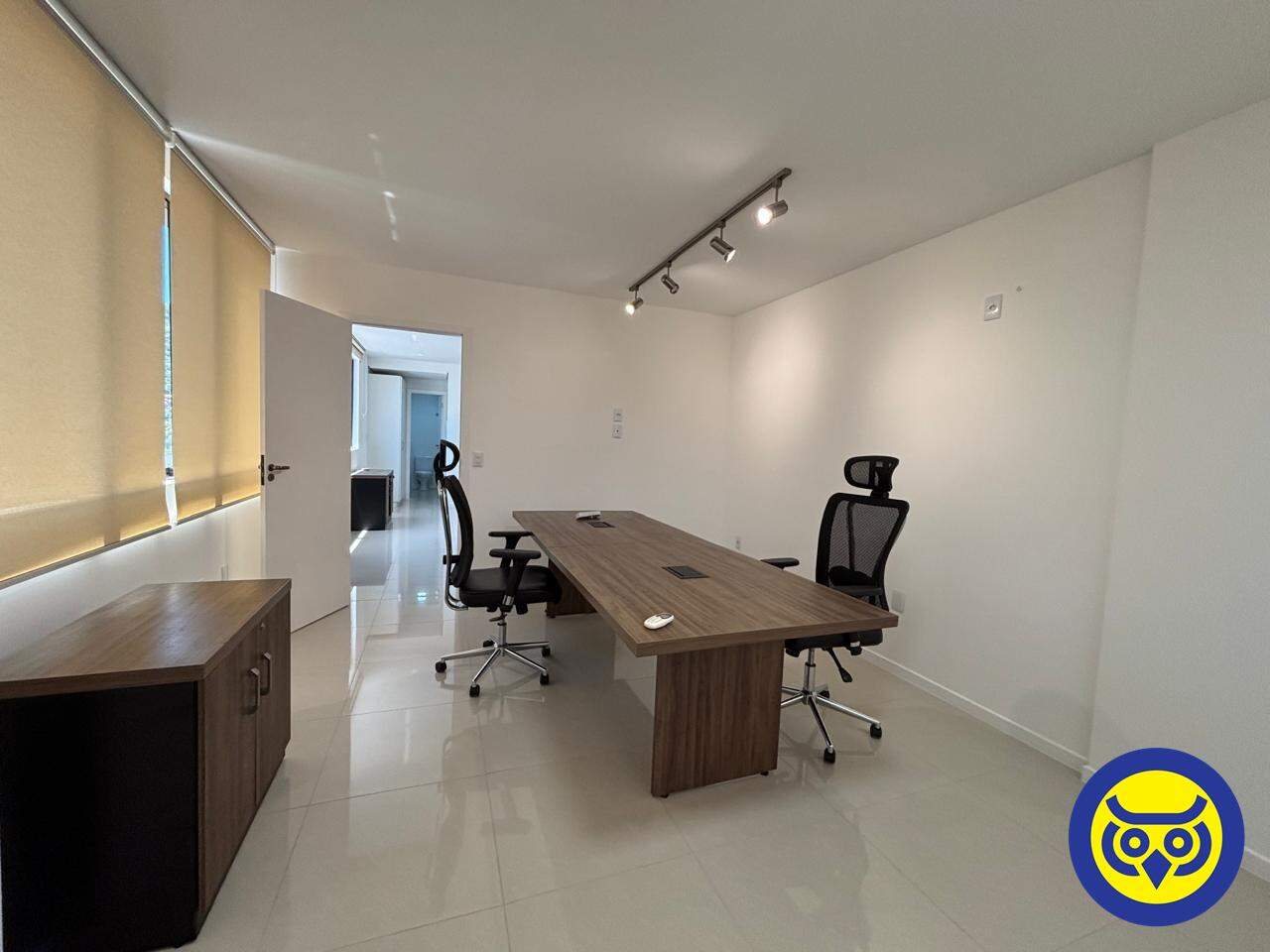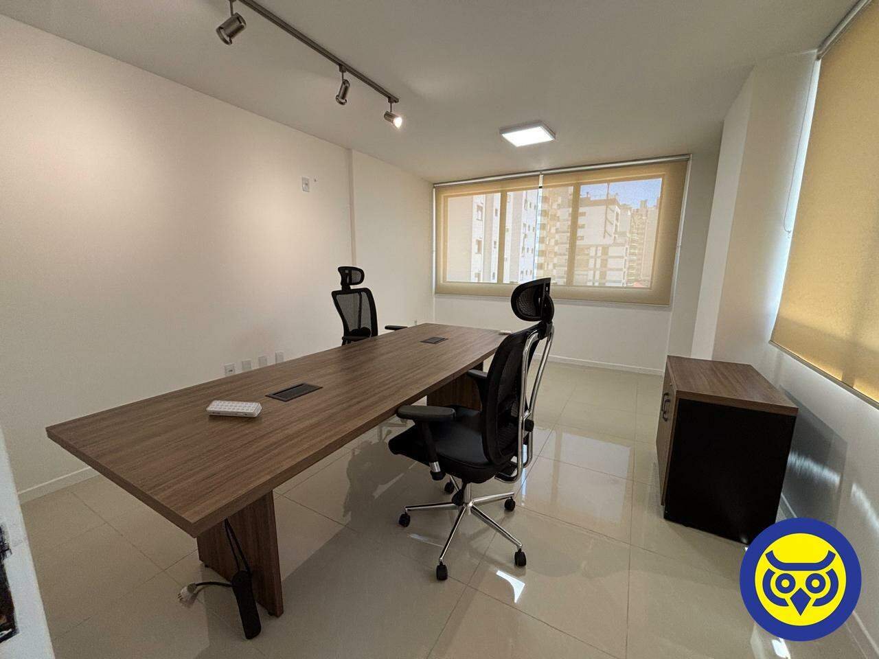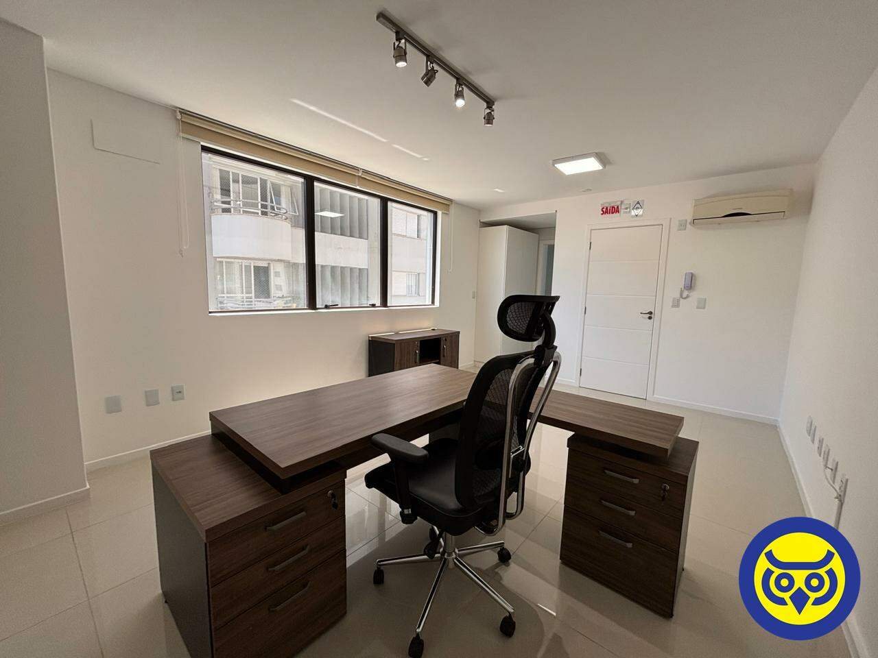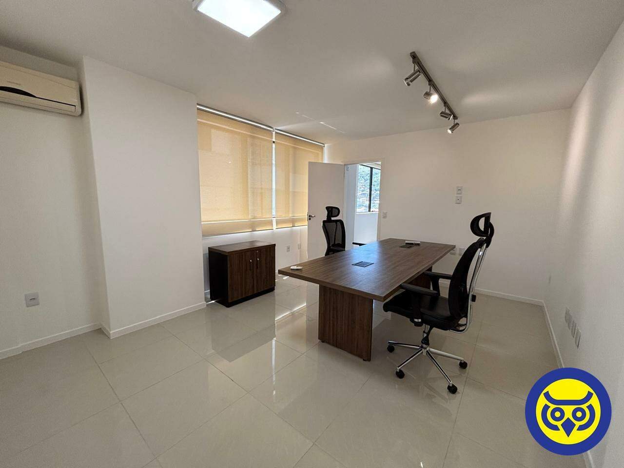 Sala comercial mobiliada para locação no bairro Centro, em Florianópolis, com 2 ambientes, 1 banheiro e 1 vaga de garagem. Possui hidrômetro individual e espera para split.