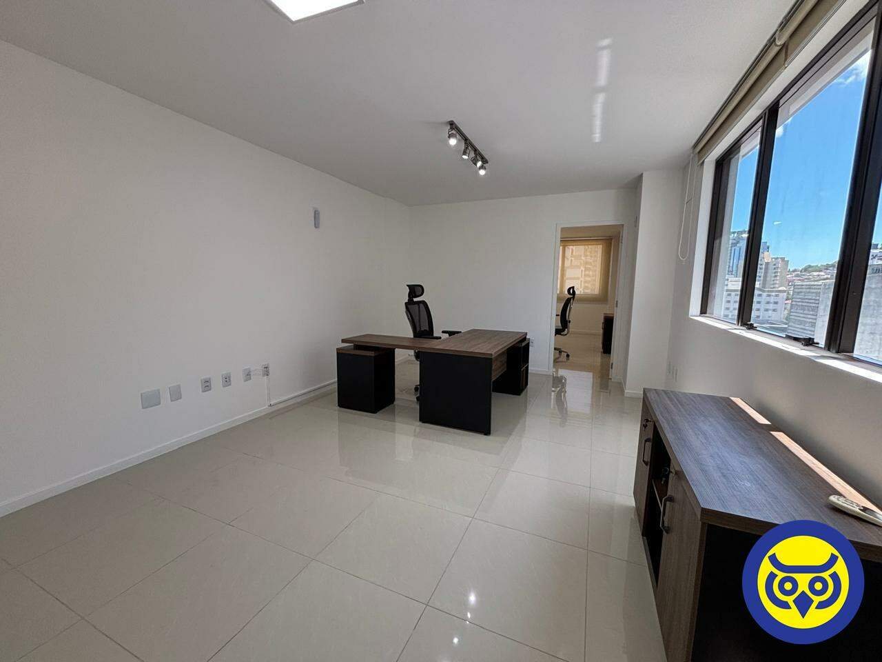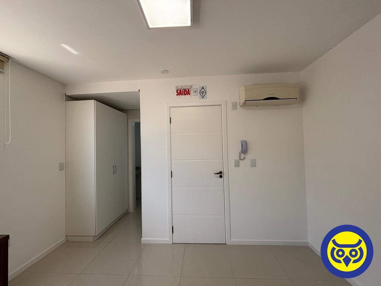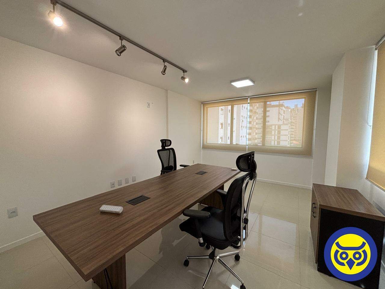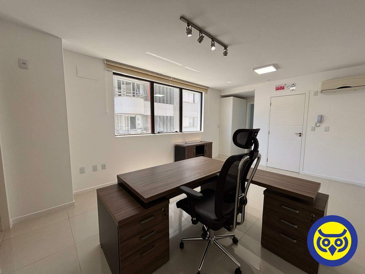 Sala comercial mobiliada para locação no bairro Centro, em Florianópolis, com 2 ambientes, 1 banheiro e 1 vaga de garagem. Possui hidrômetro individual e espera para split.