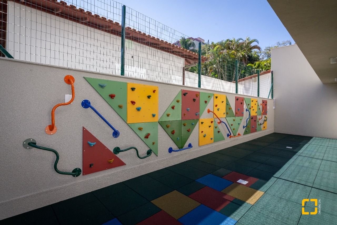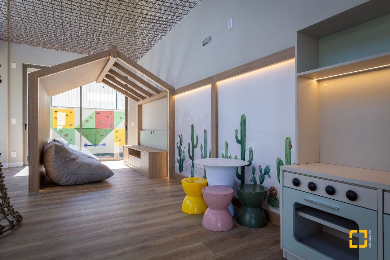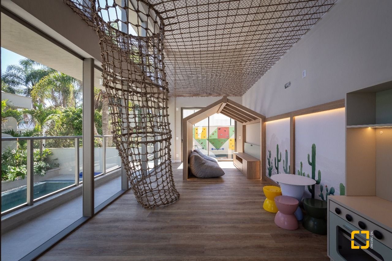 -Brinquedoteca com redário no teto e parede de escalada infantil, estimulando a imaginação e o movimento com segurança