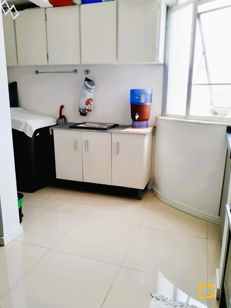 O imóvel conta com 3 dormitórios, sendo 1 suíte ampla. Os ambientes são bem distribuídos, com living espaçoso para até três ambientes integrados e mesa de jantar para seis lugares. A cozinha em estilo americano possui piso em porcelanato e está equipada com armários planejados, adega, cooktop, forno, exaustor, micro-ondas e geladeira. A área de serviço é separada e conta com armários.