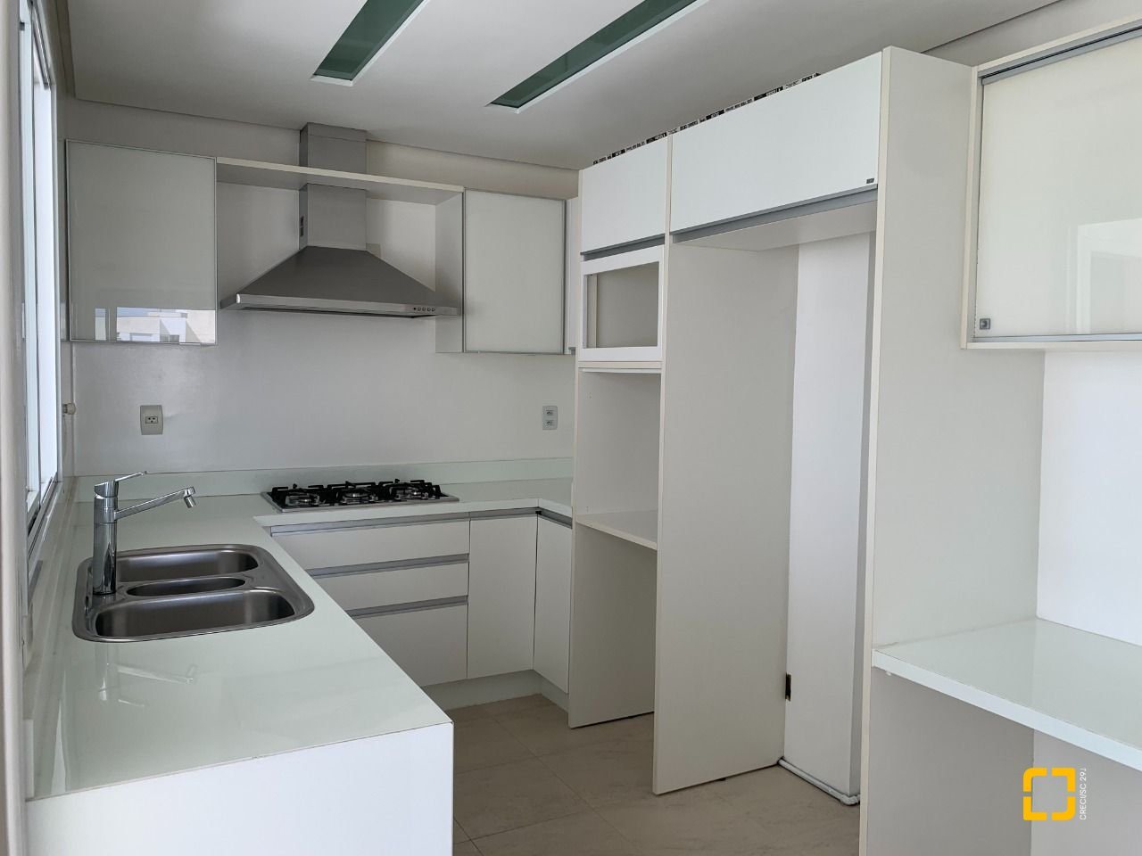 Cozinha mobiliada e equipada com cooktop e coifa.