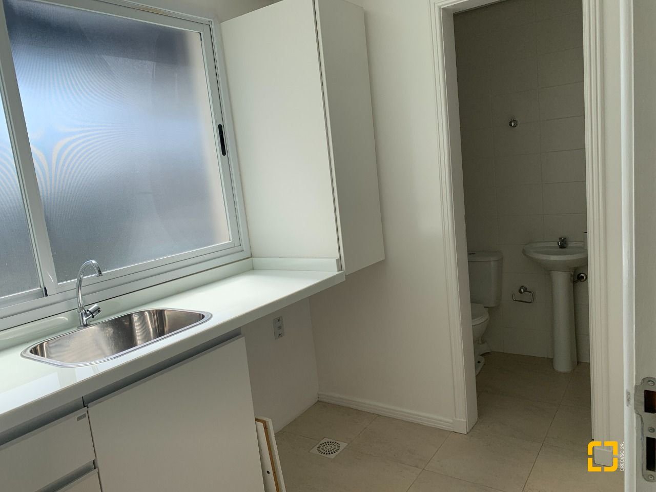 Lavanderia mobiliada e banheiro de serviço.