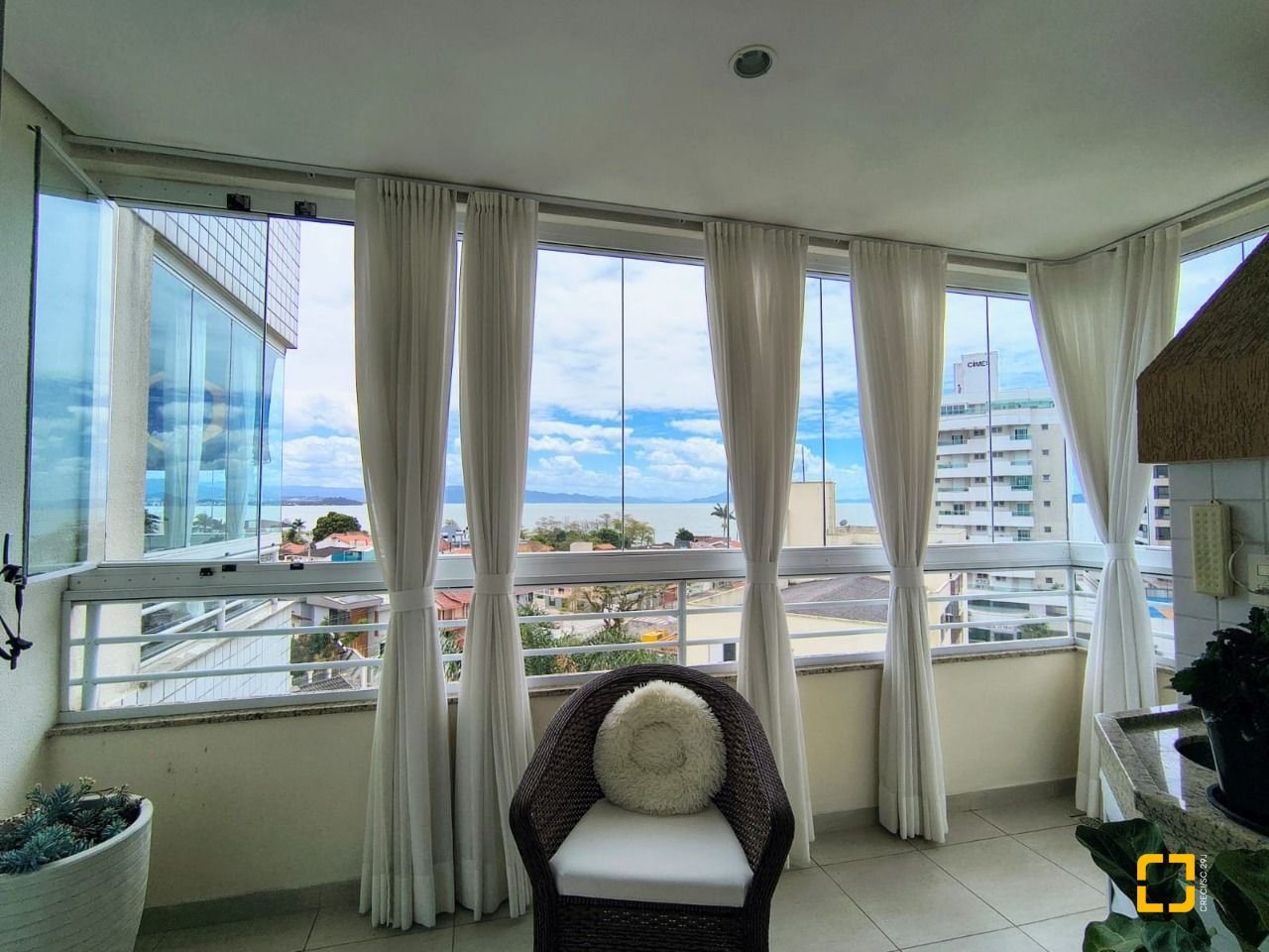 Sacada principal com churrasqueira e vista para o mar.
