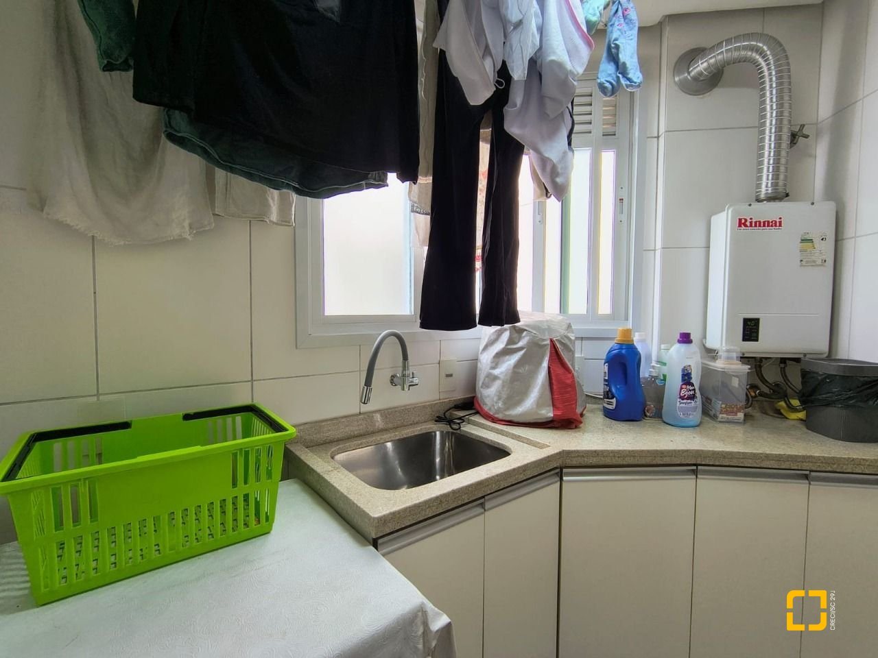 Área de serviço com banheiro, chuveiros e torneiras com água aquecida a gás.
