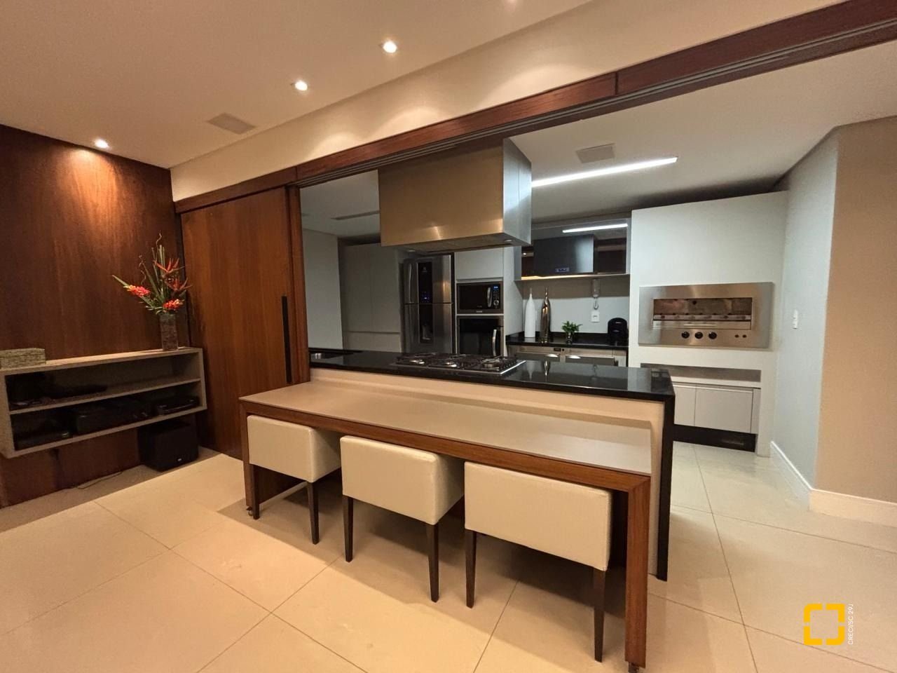 Sacada com churrasqueira integrada com a sala;