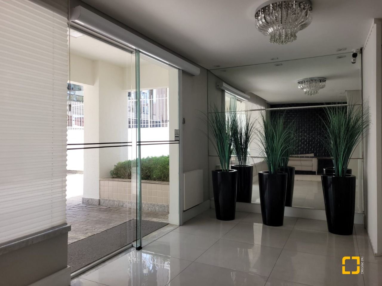 Condomínio com elevador , hall de entrada e um salão de festas com área aberta localizado no térreo.