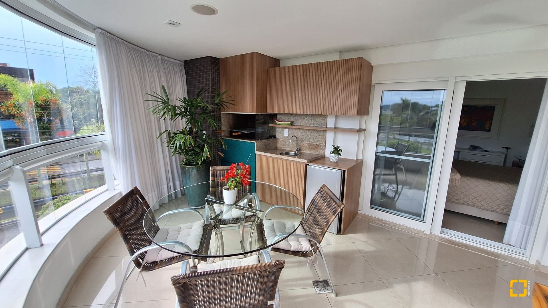 Varanda gourmet frontal de 14m², com vista livre para uma área residencial com muito verde
