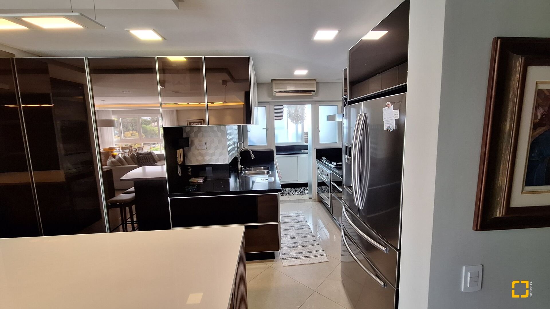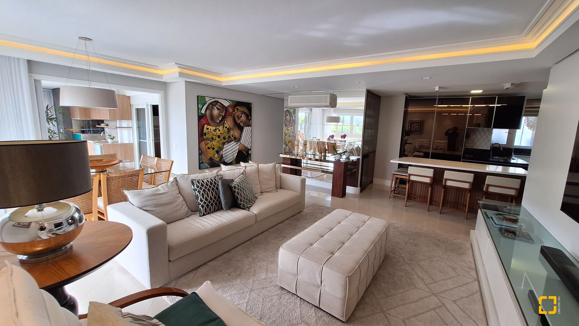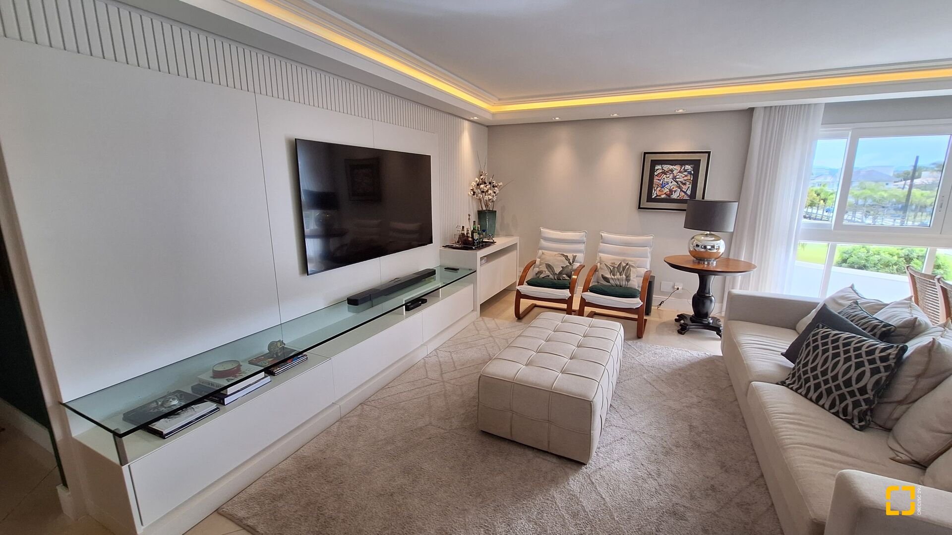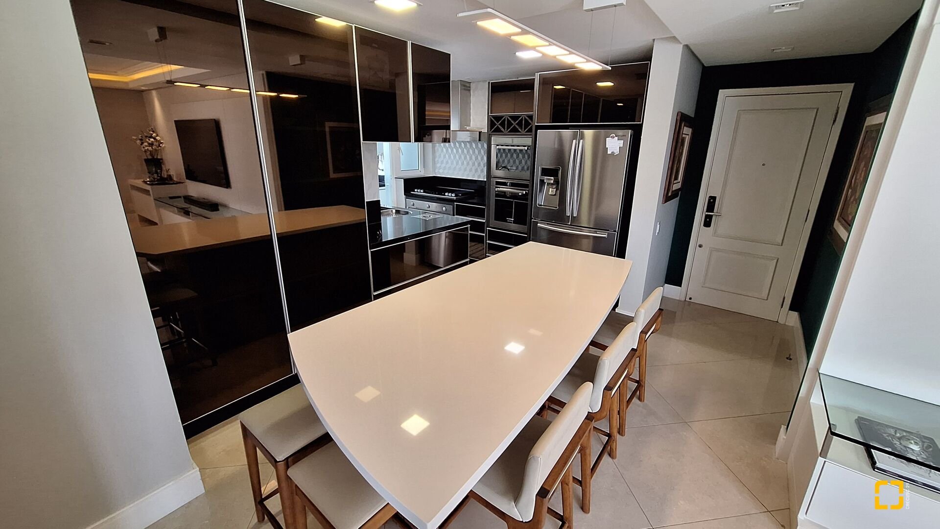Acabamentos premium: esquadrias linha gold, porcelanato brilhante nas áreas sociais e fosco na área íntima, rebaixo em gesso e projeto luminotécnico