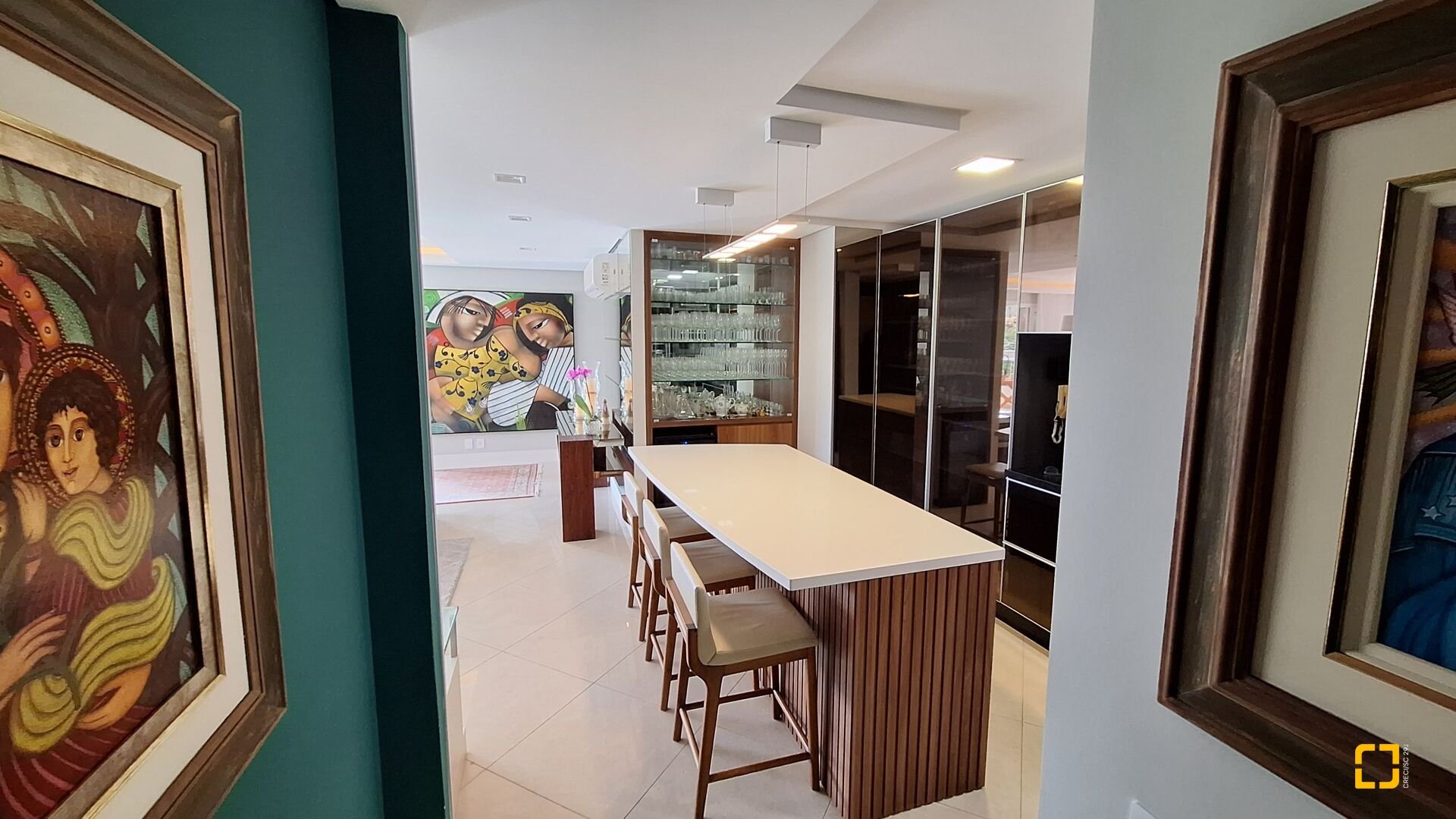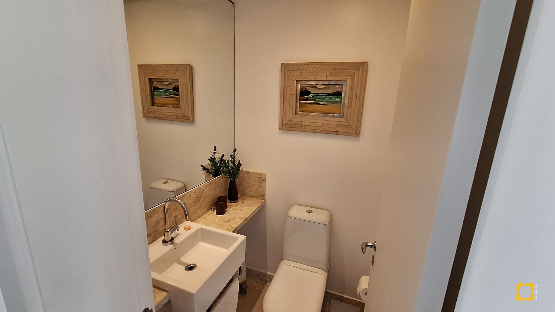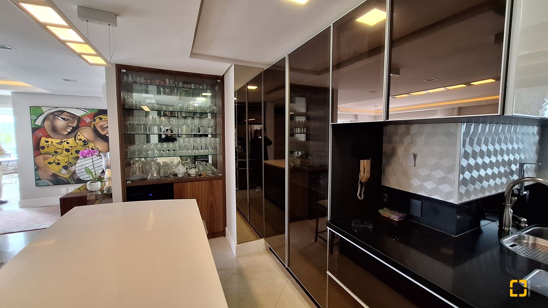 Acabamentos premium: esquadrias linha gold, porcelanato brilhante nas áreas sociais e fosco na área íntima, rebaixo em gesso e projeto luminotécnico