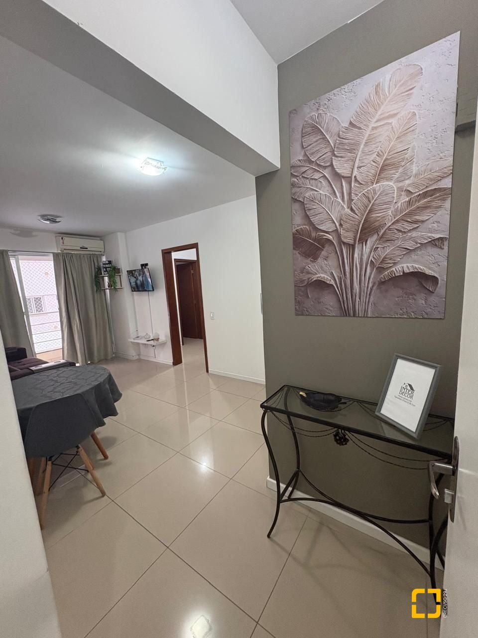 Área social: sala de estar e jantar integradas, ar-condicionado, Smart TV 32", sofá confortável e sacada.