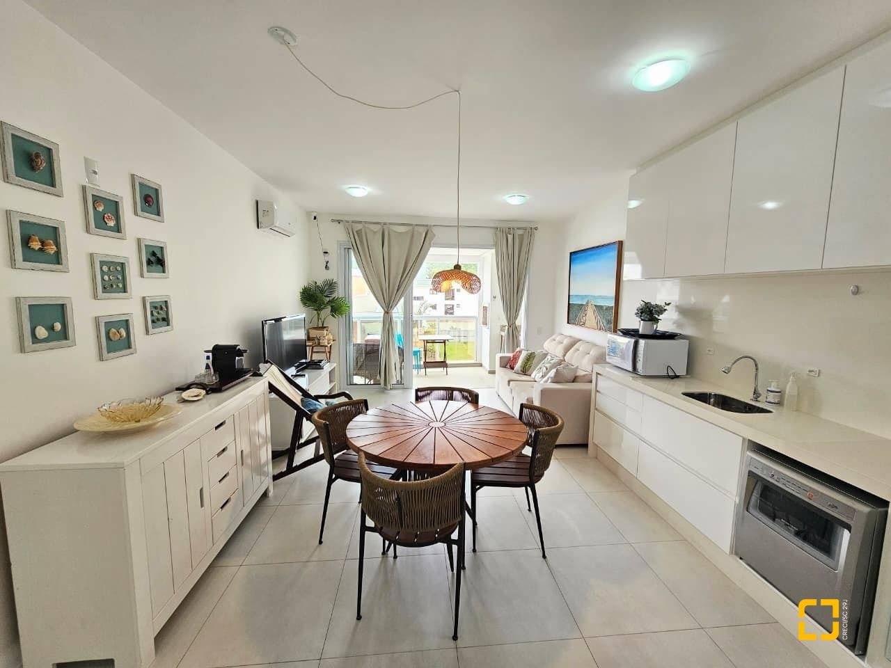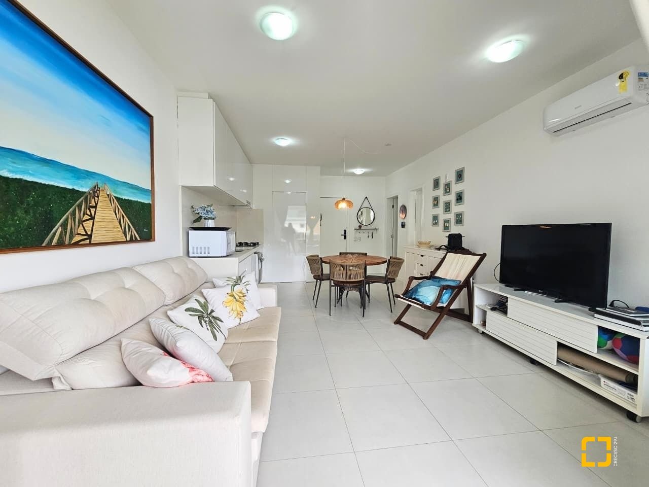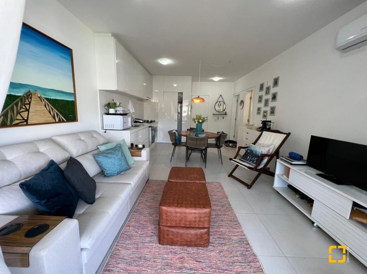 Apartamento com ótima planta, 84m² privativos. Confortável com sala ampla com sofá e rack, tv e ar condicionado, ambiente integrado com a cozinha e linda sacada gourmet com churrasqueira.