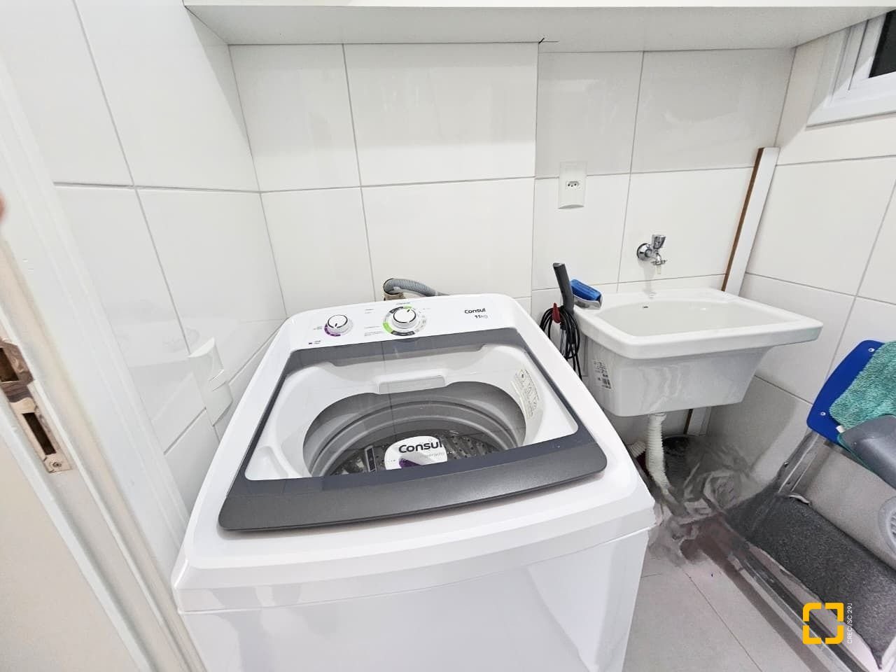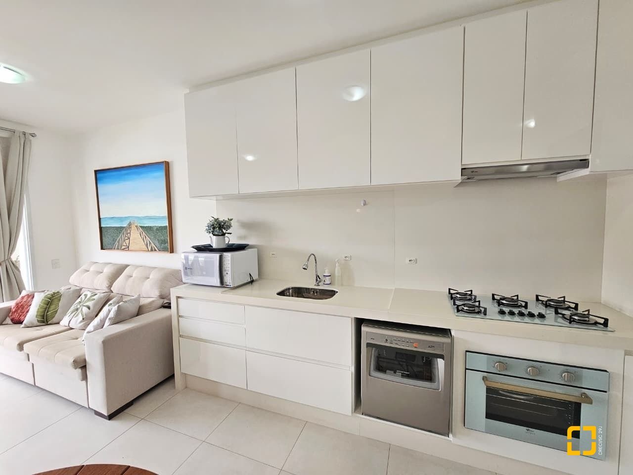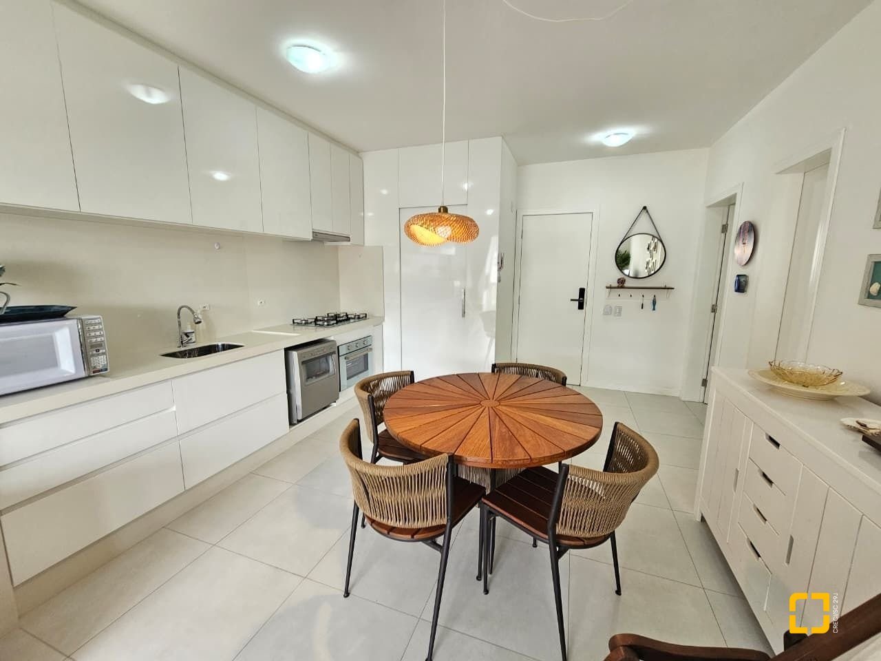 Cozinha com armários planejdos, fogão e forno, lavalouças e microondas; mesa para 4 lugares e aparador buffet. Área de serviço separada com tanque e geladeira.