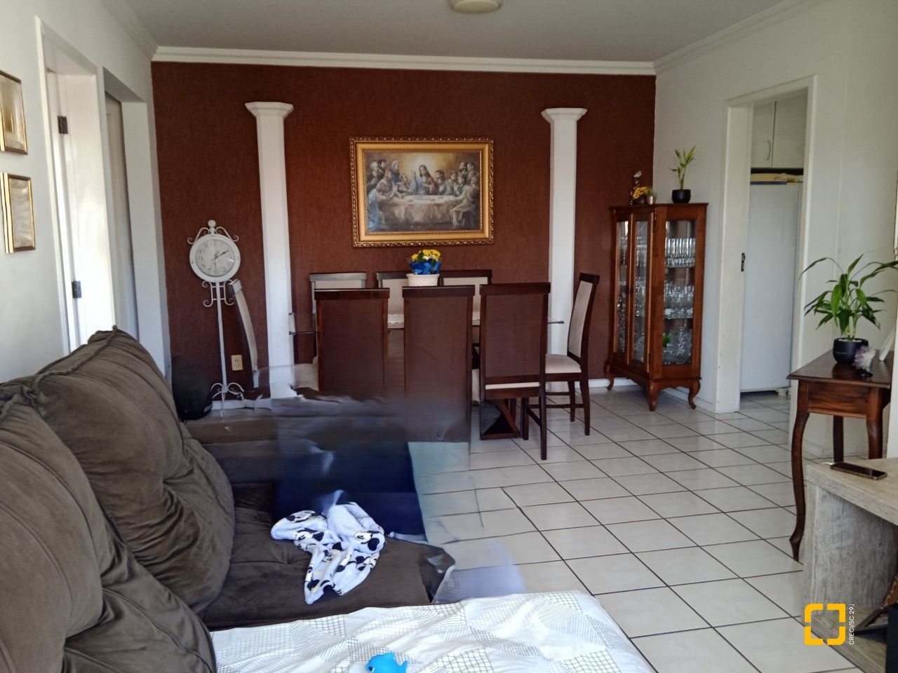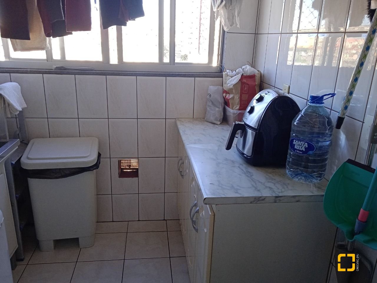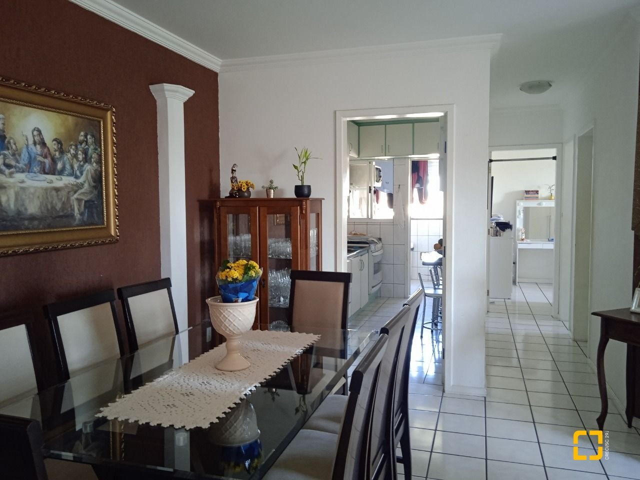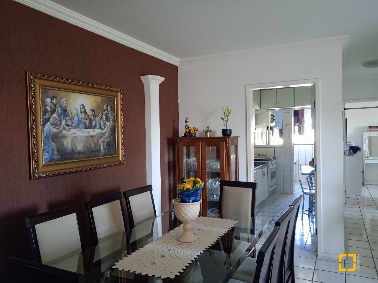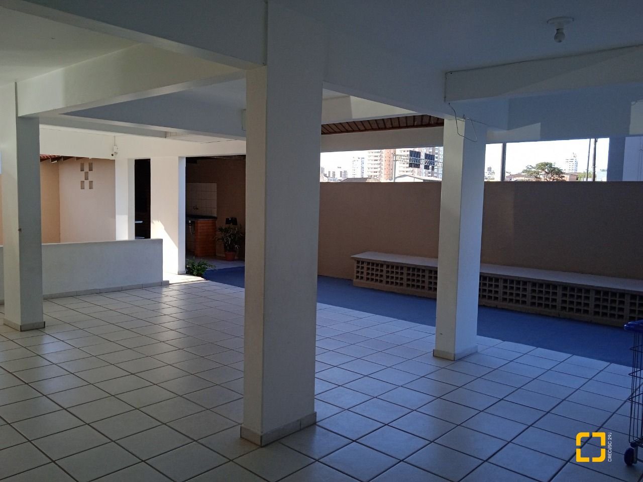 O apartamento com cozinha grande, área de serviço, 3 quartos, sendo 1 suíte, uma espaçosa sala para 2 ambientes (TV e refeição), com sacada, 2 banheiros e 1 garagem/coberta.