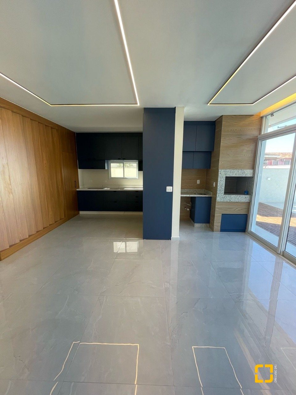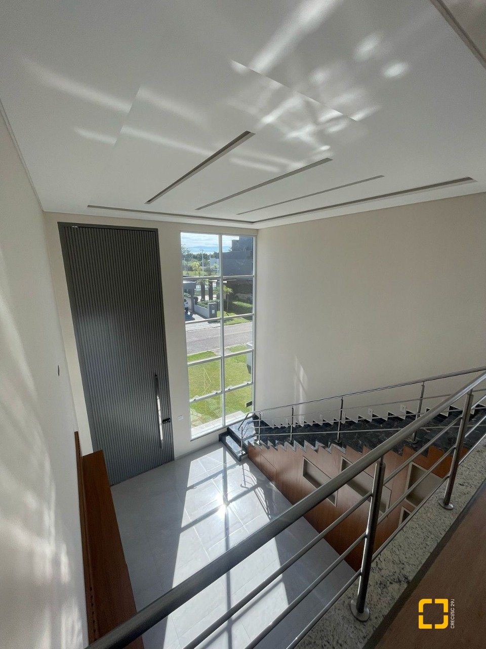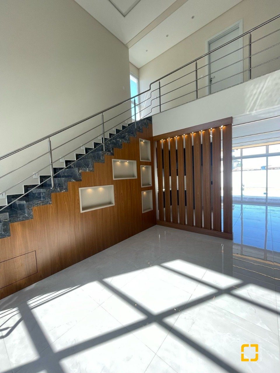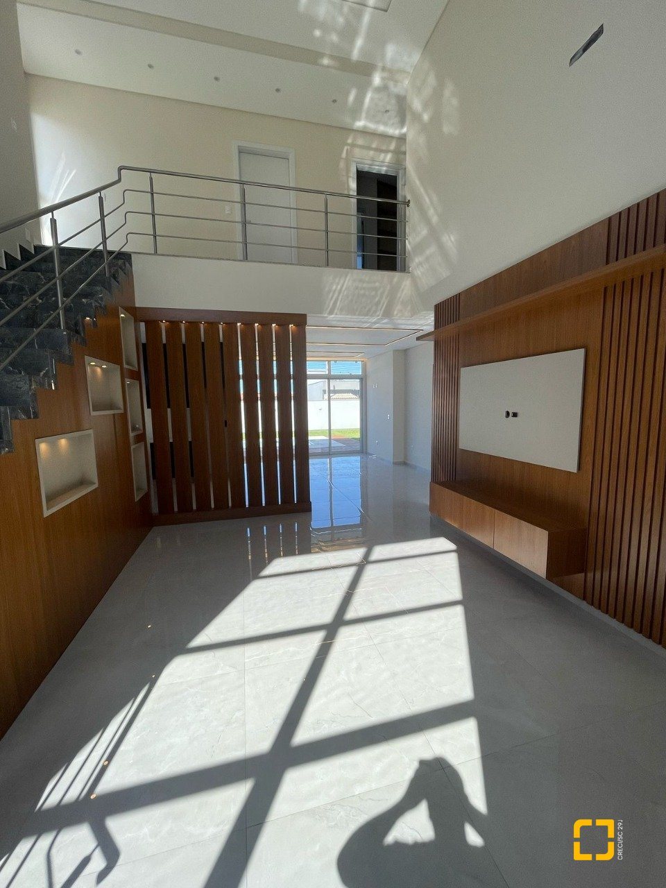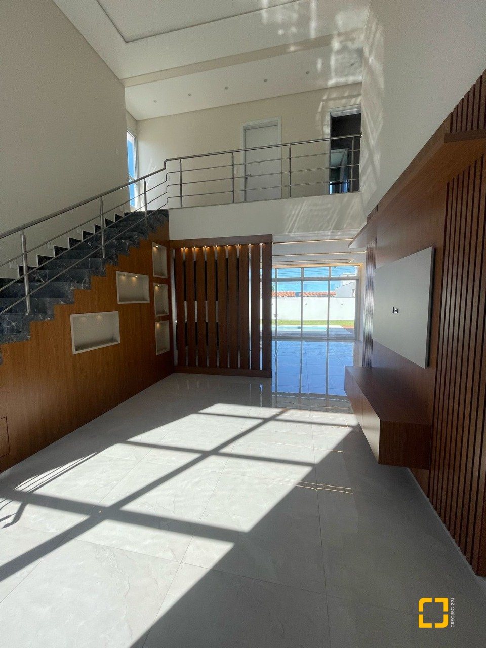 O interior impressiona com o pé-direito duplo, integração entre sala, cozinha e varanda, e uma iluminação natural espetacular, graças à posição solar privilegiada voltada para o norte.