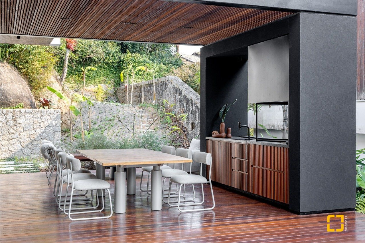 Na área externa em frente ao living fica a piscina com hidromassagem, o espaço gourmet e um amplo deck. Acabamentos de excelente qualidade, como alumínios pretos classe A da Lohn. Jardins com paisagismo e irrigação. Mobiliário da Figo Casa, podendo ser negociado à parte. Garagem para 4 carros com depósito.