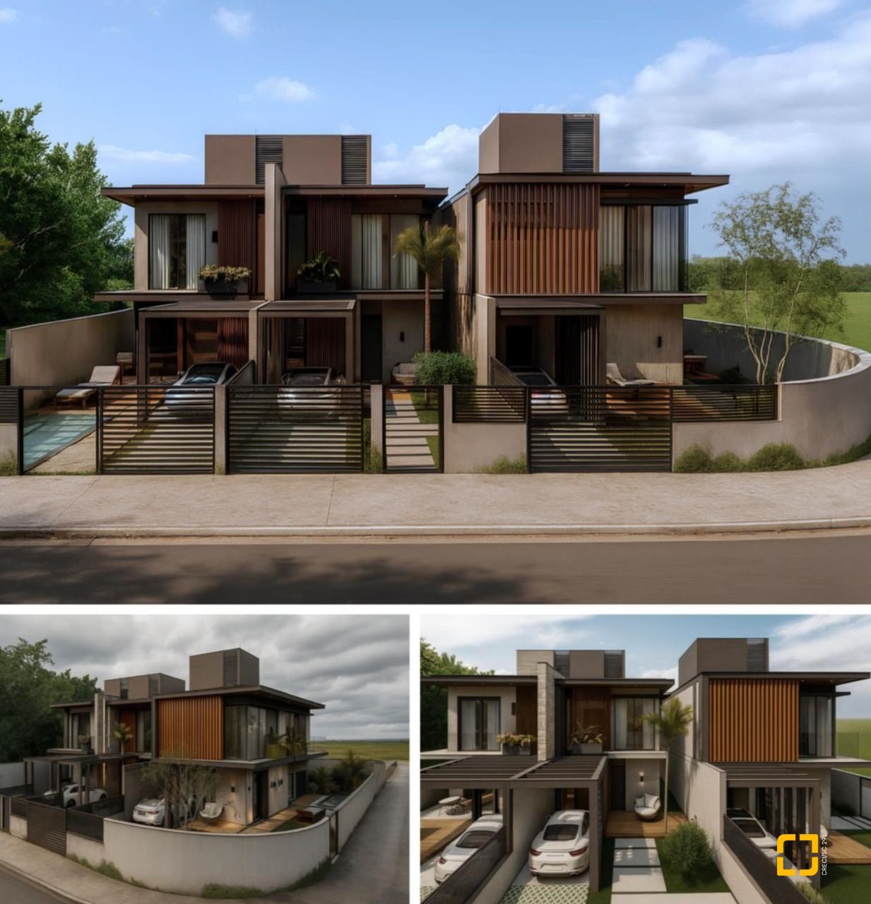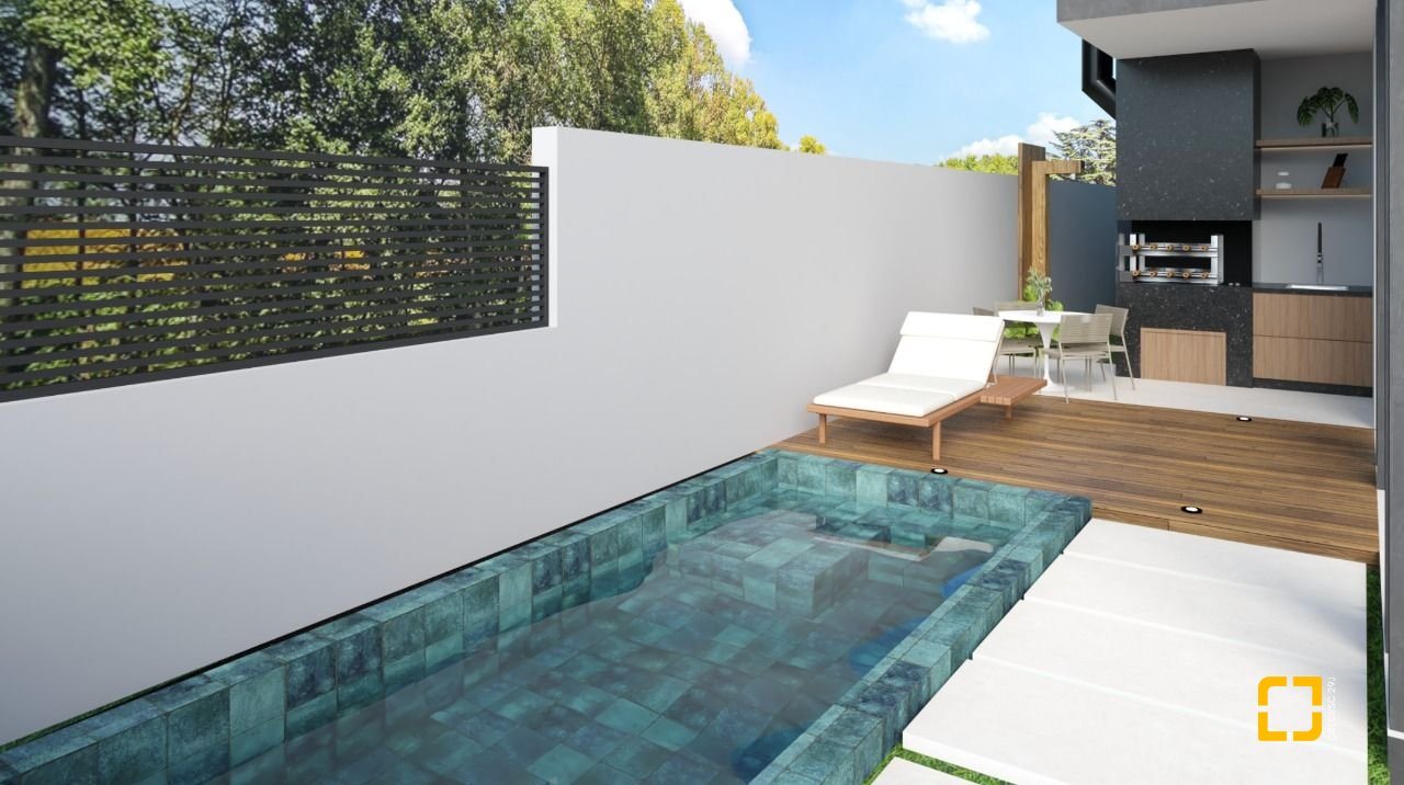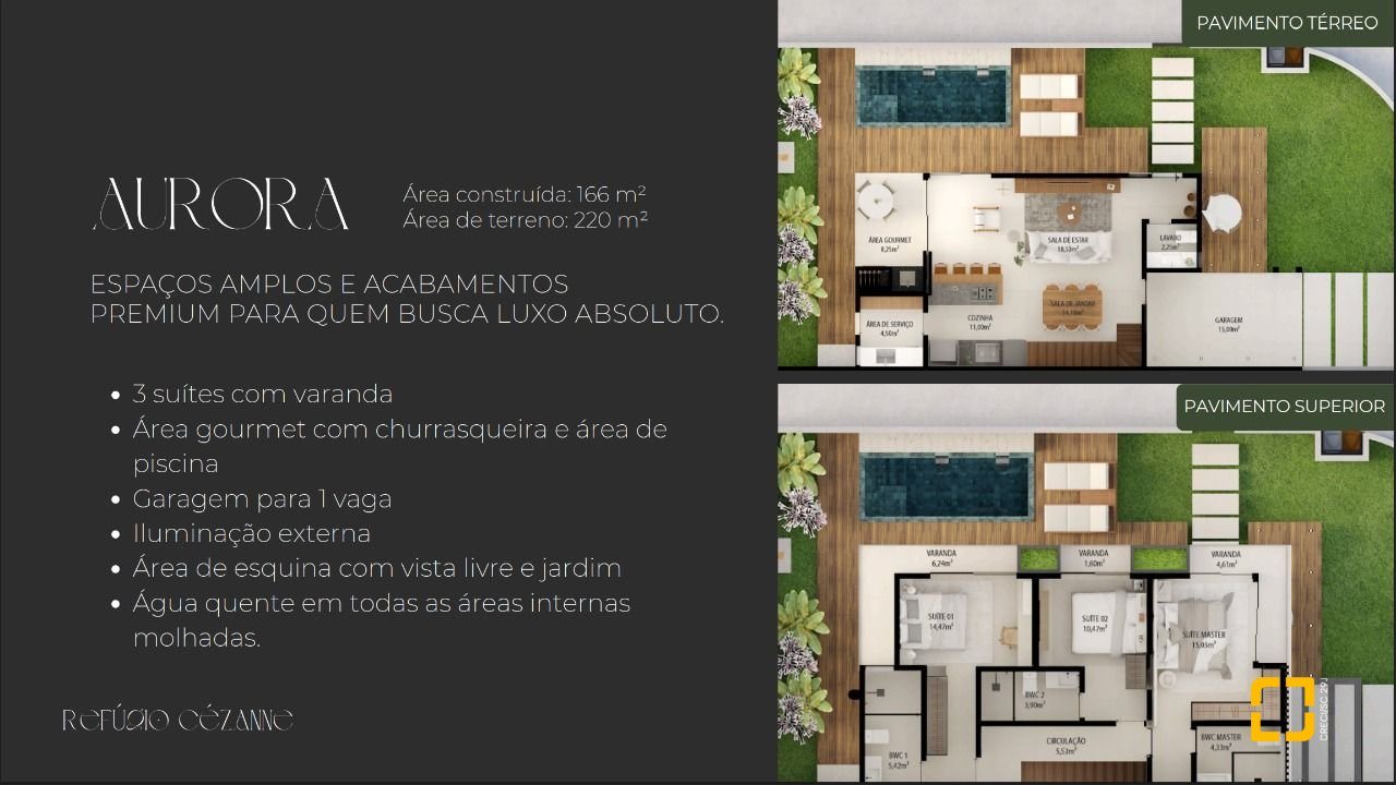Casa com 2 pavimentos, com 166 m² privativos em terreno de 220 m². O piso superior possui 3 suítes, sendo uma suíte master com varanda. O piso inferior possui um living com sala de estar, sala de jantar, cozinha, área de serviço, lavabo, área gourmet com churrasqueira e piscina privativa, garagem para 1 vaga e área de jardim com vista livre. Ambientes amplos e água quente em todas as áreas internas molhadas.
