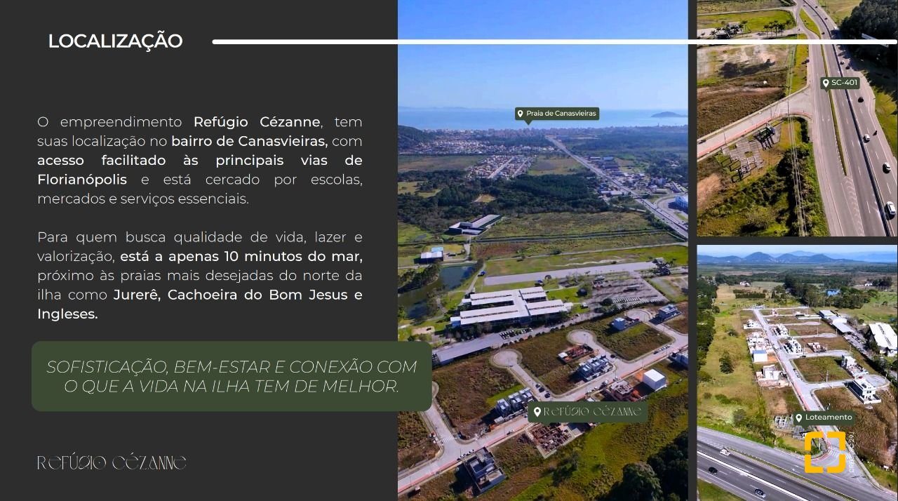 Localizado no loteamento Alameda Cézanne, em Canasvieiras, um dos bairros mais valorizados do norte de Florianópolis, o empreendimento está cercado por natureza e estrategicamente conectado à cidade: na SC-401 e próximo às praias mais desejadas da região.