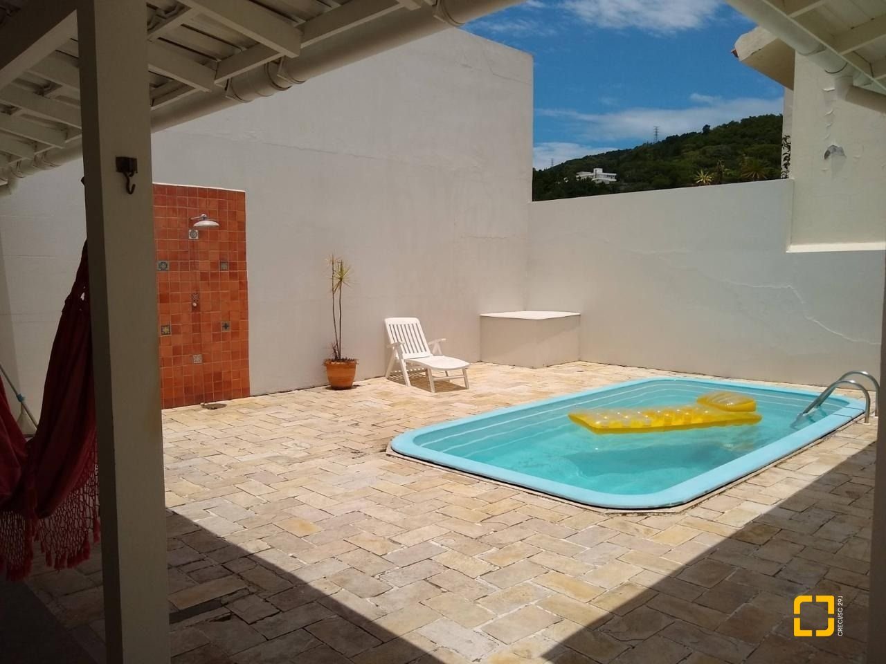 Área externa com solarium, piscina e espaço gourmet com churrasqueira a carvão, lavabo e depósito/quarto