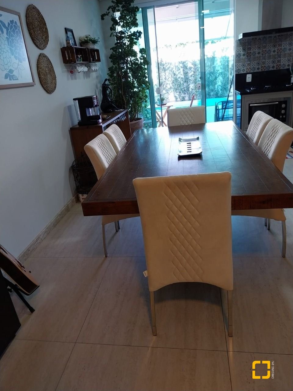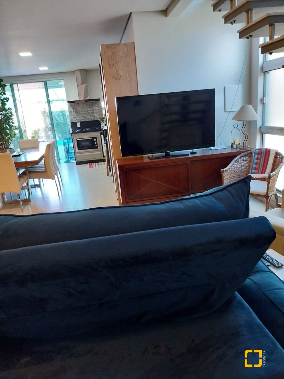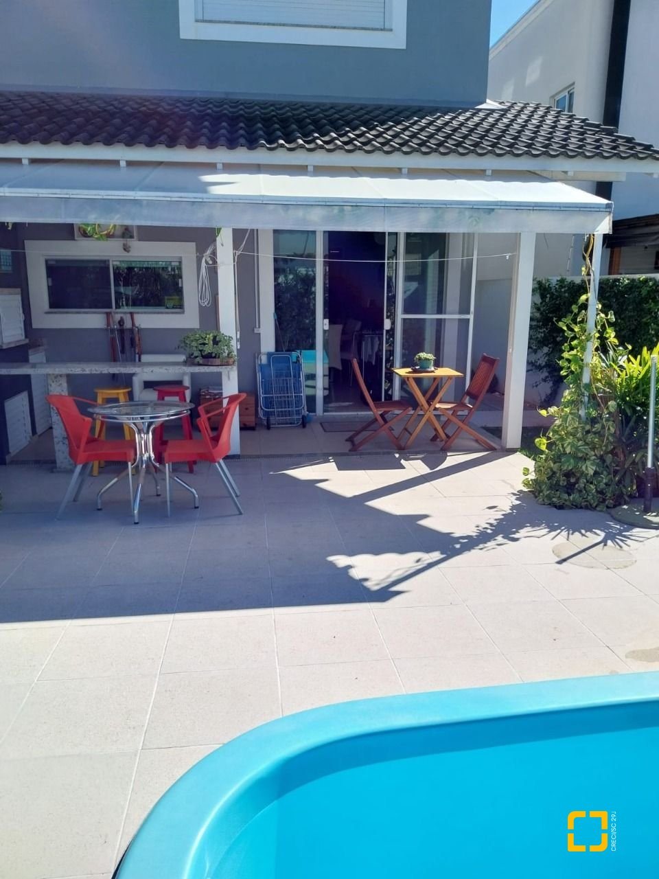 sala de estar, jantar e cozinha integradas com armários planejados, banheiro social, lavanderia, área gourmet externa com amplo quintal churrasqueira integrada à área da piscina. No piso superior 3 suítes espaçosas e sacada.