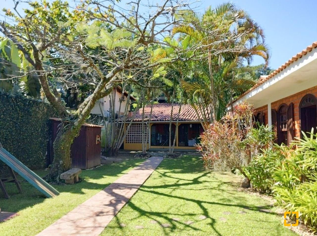Espaço de jardim em comum para as duas casas, porém muito amplo, com espaço gramado, árvores e até espaço para parquinho de crianças. Vaga de estacionamento na frente da casa com espaço para, pelo menos, 3 carros.