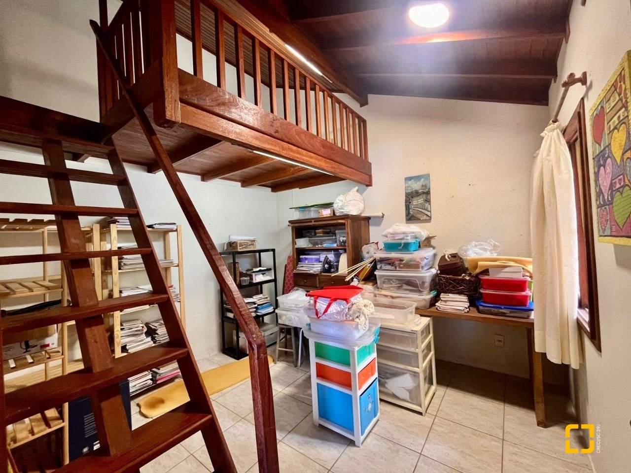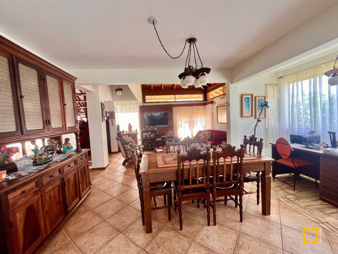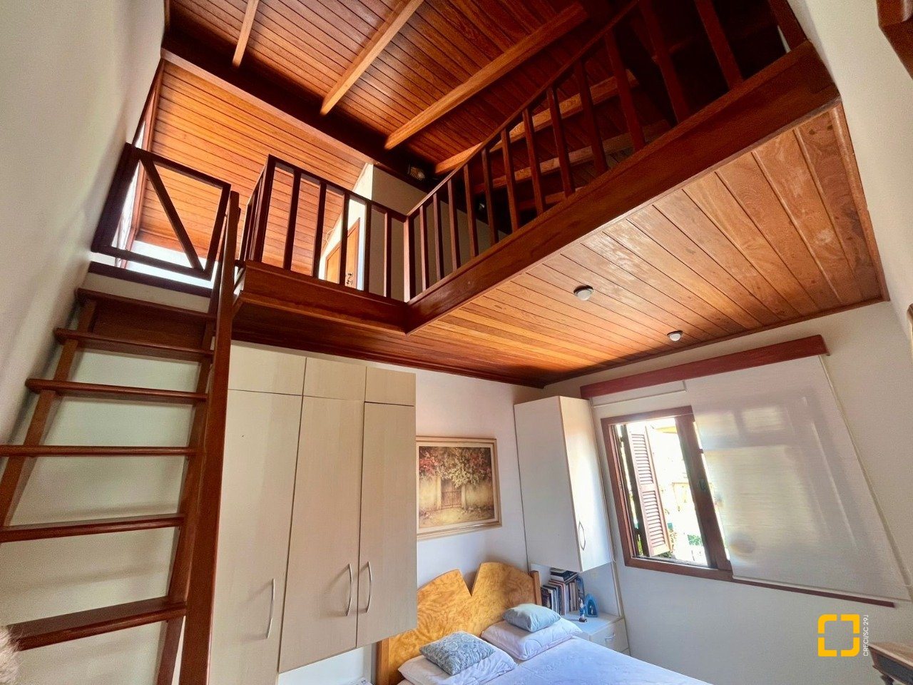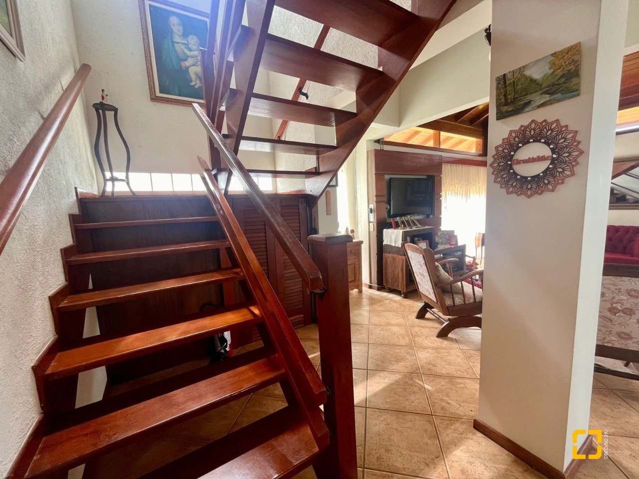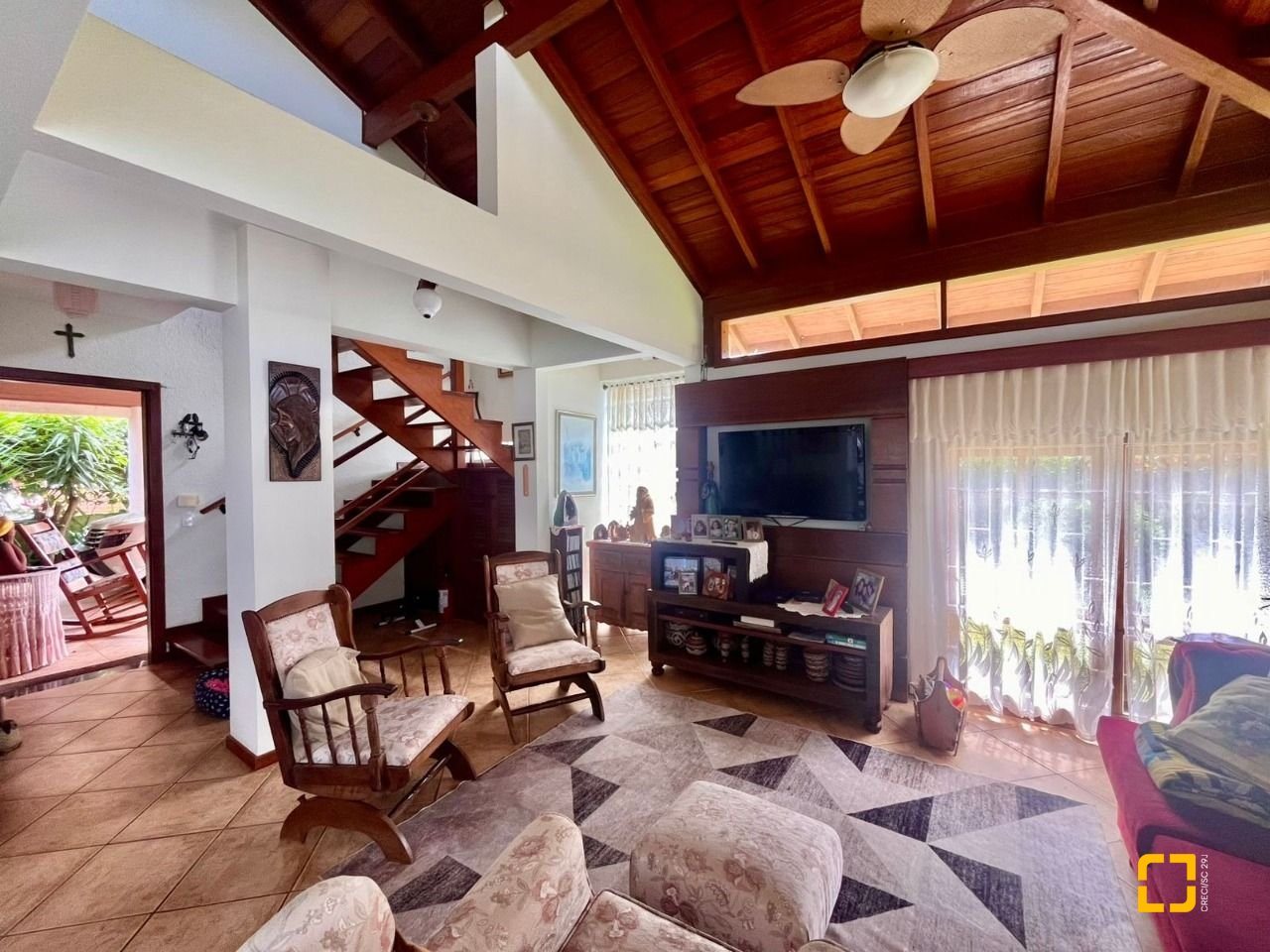 No térreo, ao entrar uma sala de TV integrada com a sala de jantar, cozinha em L com armários embutidos, 2 dormitórios, sendo 1 deles uma suíte e o outro com mezanino. No piso superir possui mais 3 dormitórios, sendo uma suíte master com closet e um banheiro social completa este andar.