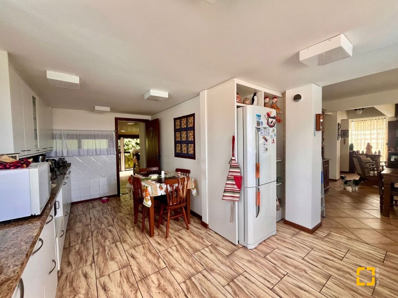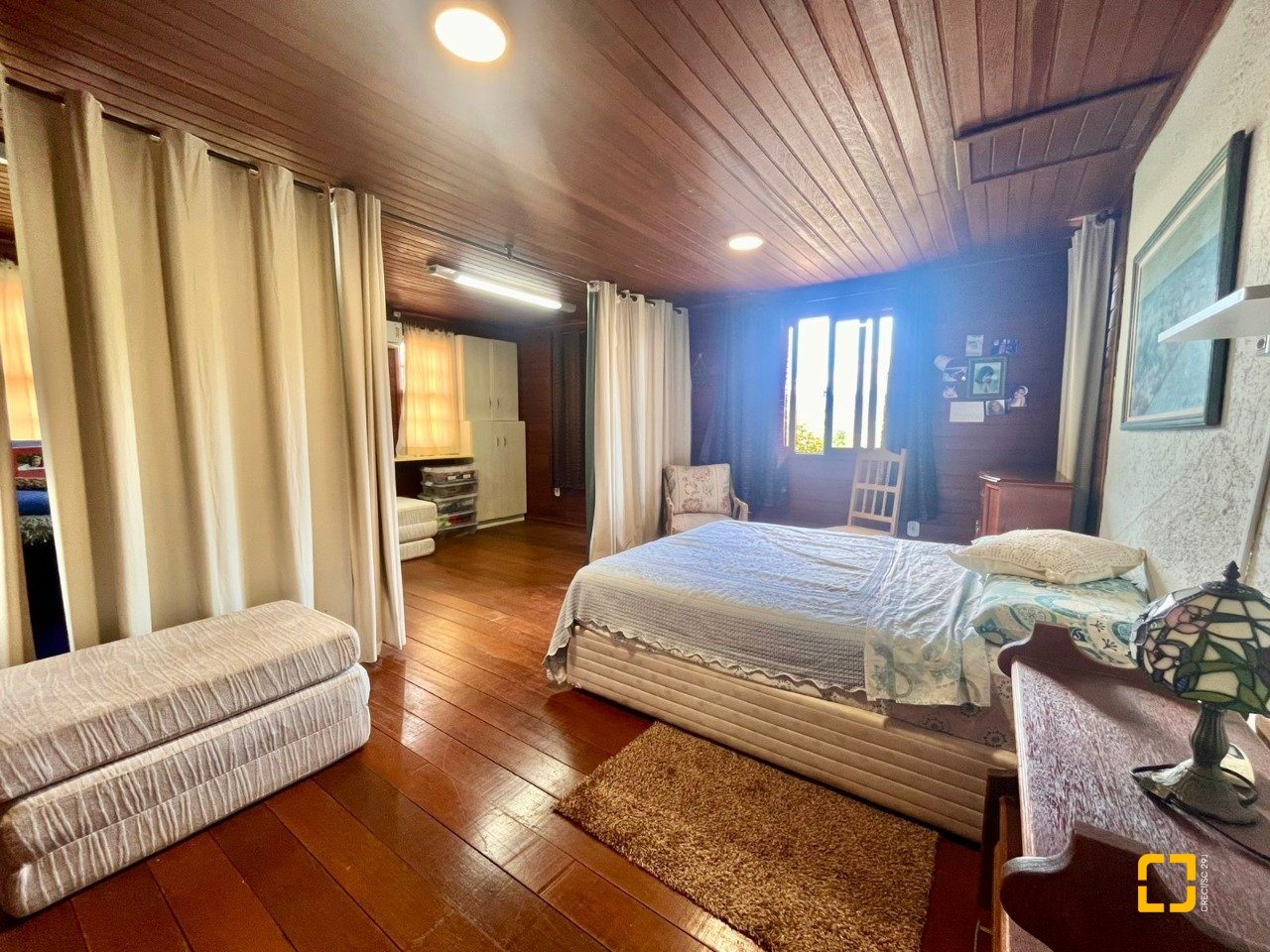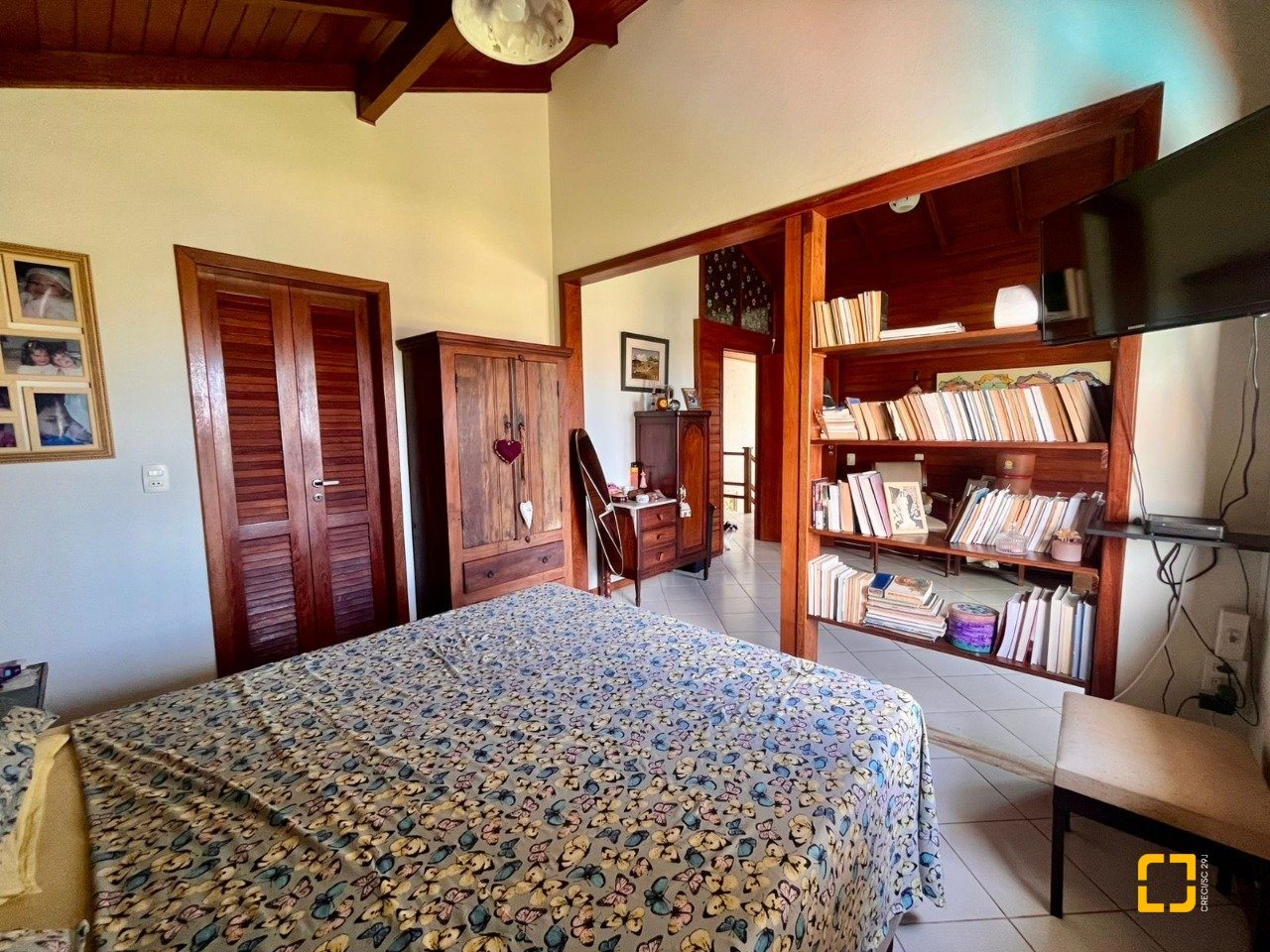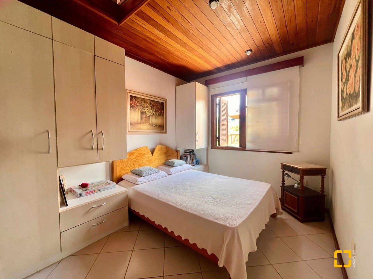 No térreo, ao entrar uma sala de TV integrada com a sala de jantar, cozinha em L com armários embutidos, 2 dormitórios, sendo 1 deles uma suíte e o outro com mezanino. No piso superir possui mais 3 dormitórios, sendo uma suíte master com closet e um banheiro social completa este andar.