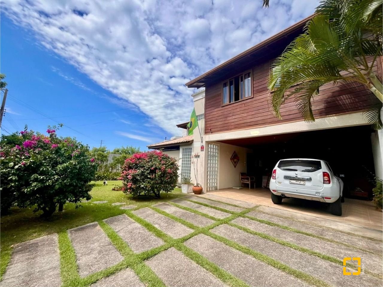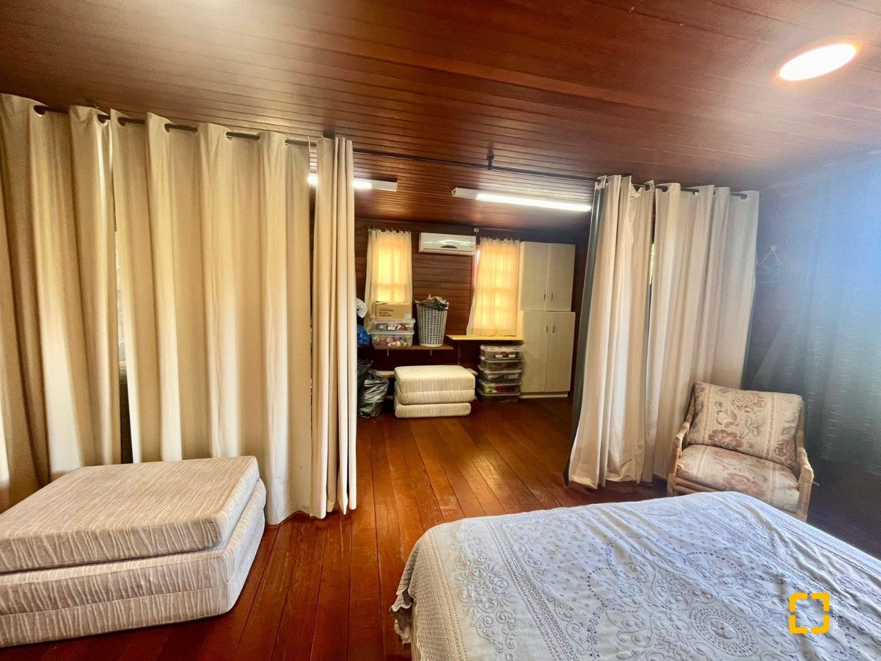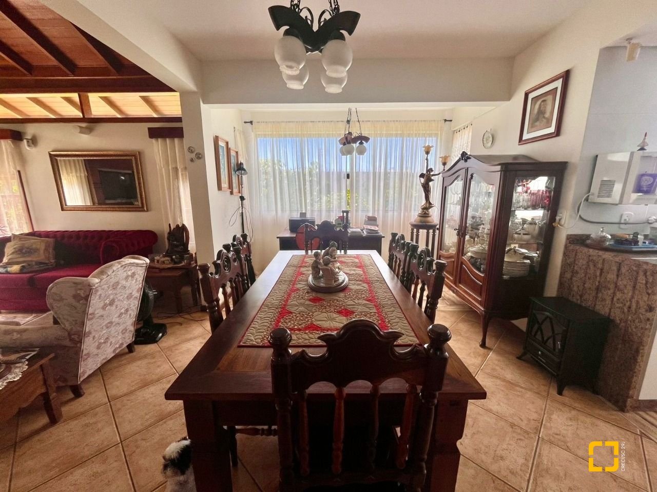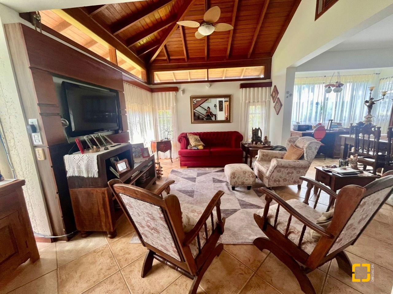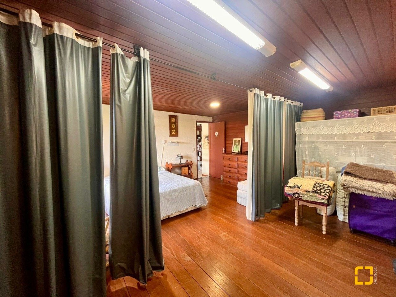 No térreo, ao entrar uma sala de TV integrada com a sala de jantar, cozinha em L com armários embutidos, 2 dormitórios, sendo 1 deles uma suíte e o outro com mezanino. No piso superir possui mais 3 dormitórios, sendo uma suíte master com closet e um banheiro social completa este andar.