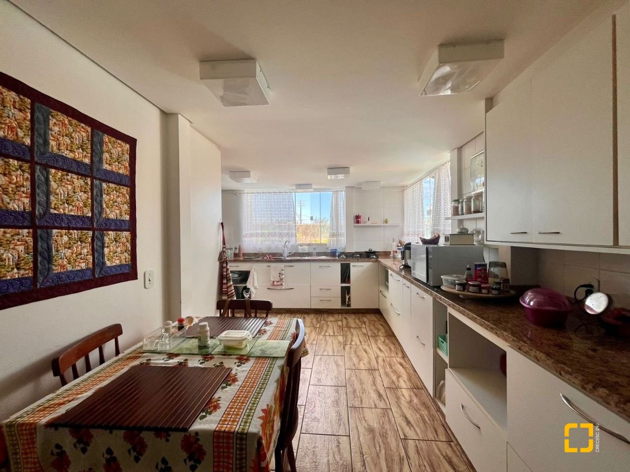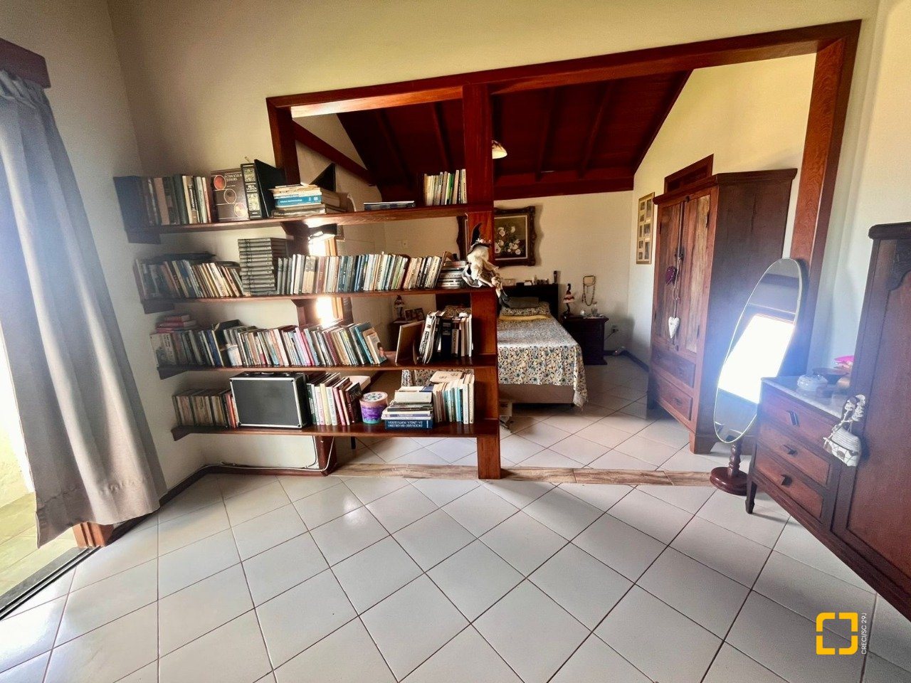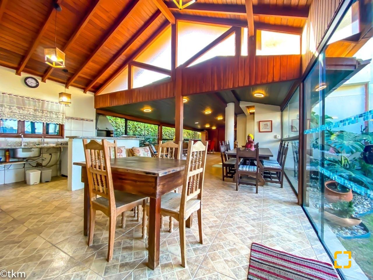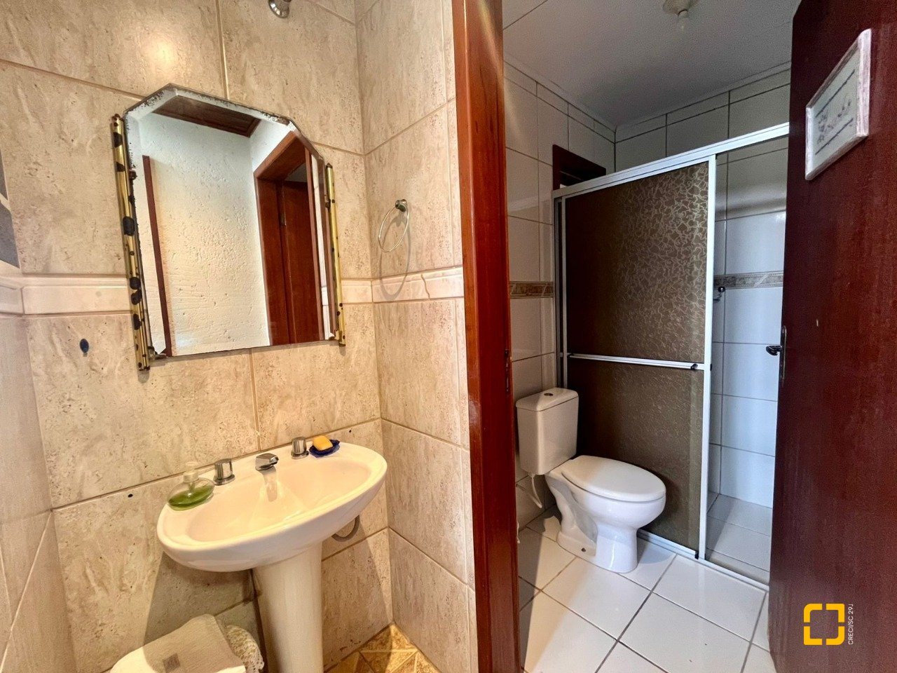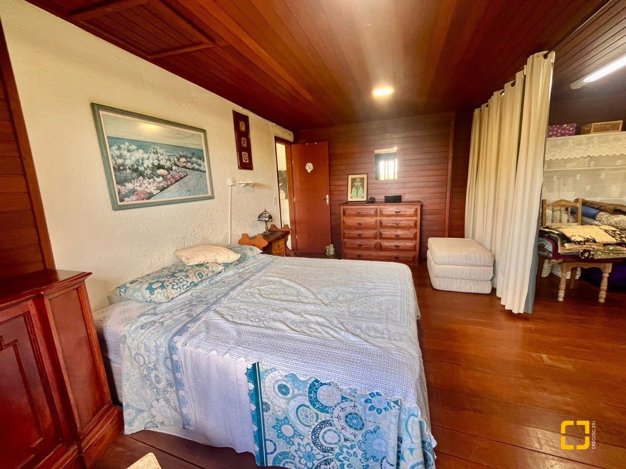 No térreo, ao entrar uma sala de TV integrada com a sala de jantar, cozinha em L com armários embutidos, 2 dormitórios, sendo 1 deles uma suíte e o outro com mezanino. No piso superir possui mais 3 dormitórios, sendo uma suíte master com closet e um banheiro social completa este andar.