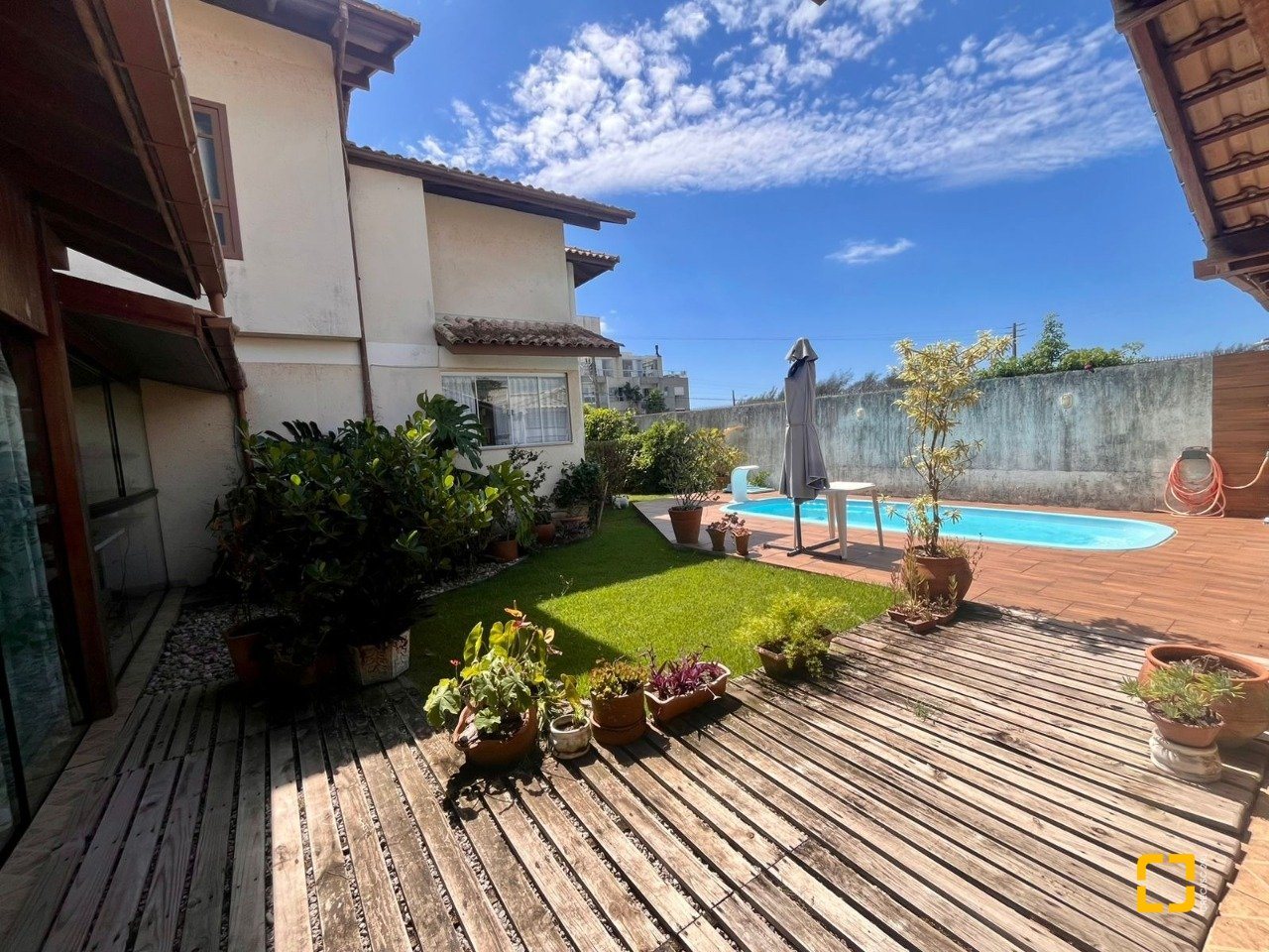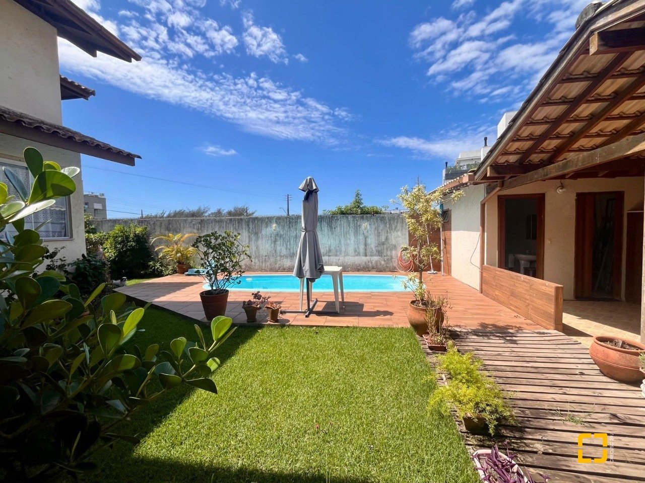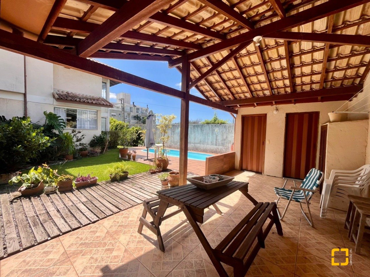 Para momentos de lazer e socialização, um amplo salão completo, com espaço para sofá e mesa integradas com a área gourmet com churrasqueira e banheiro social, alem disso na área externa possui uma piscina e mais um banheiro completo, lavanderia e espaço para depósito.