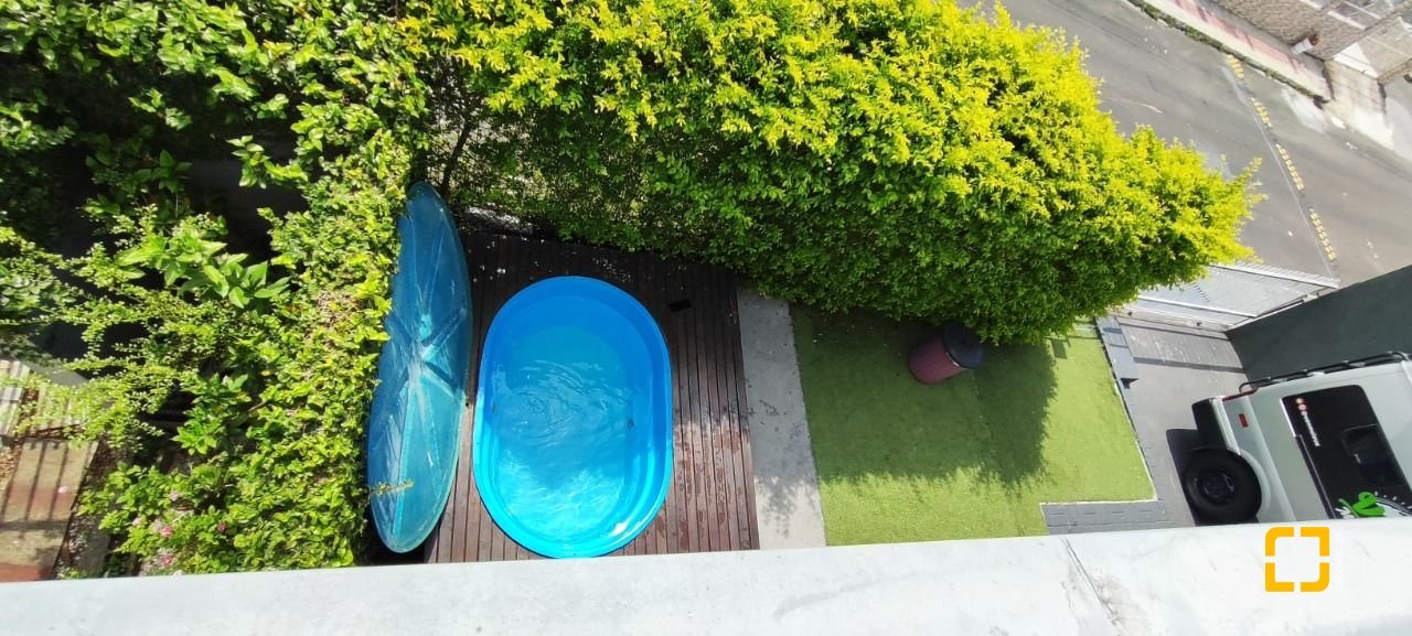 Deck com piscina 1000L no jardim da frente.