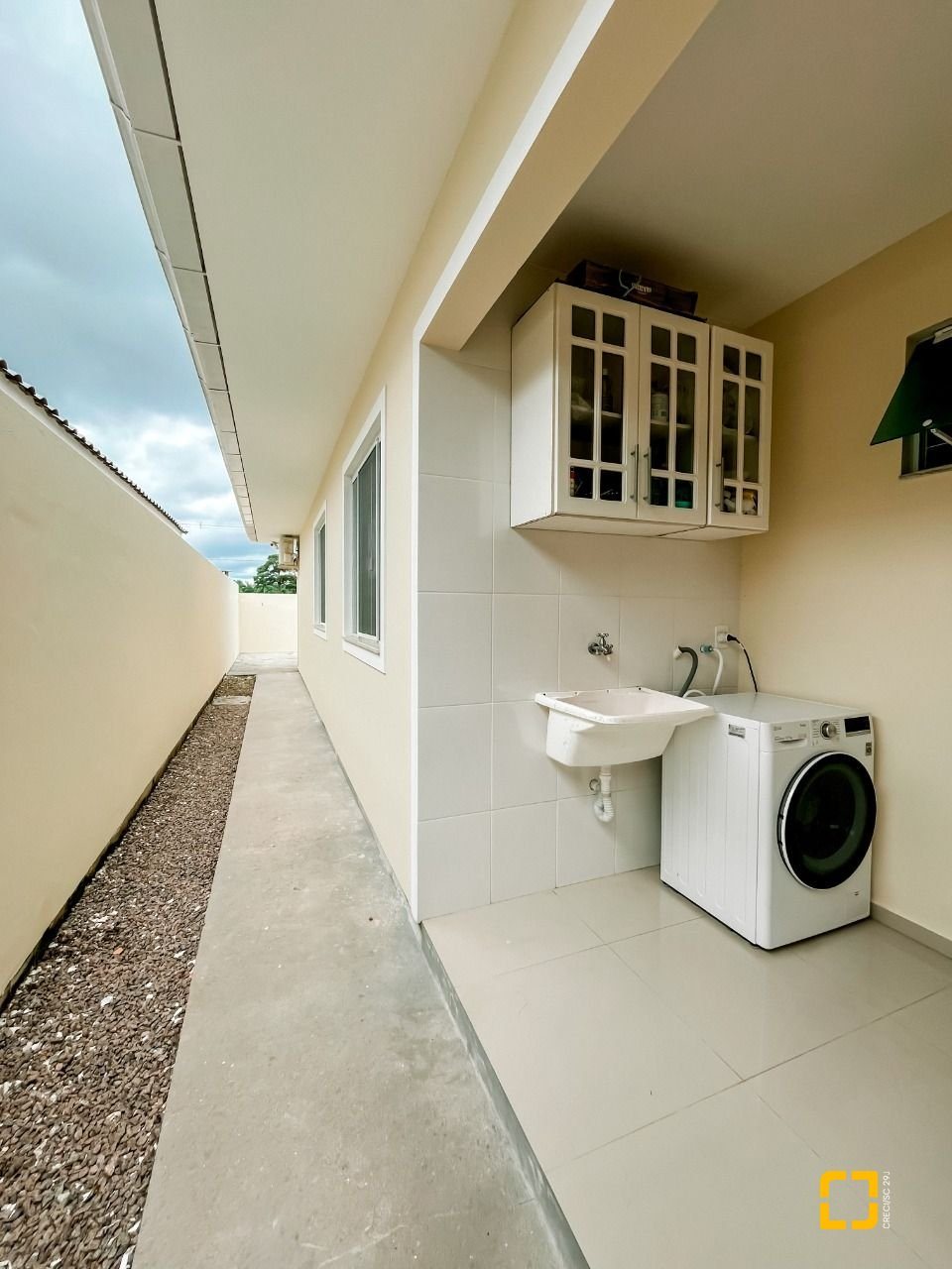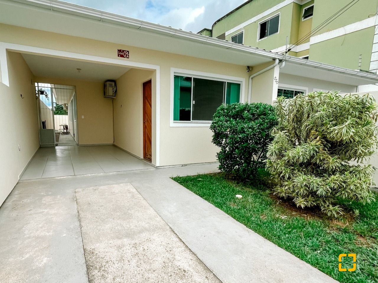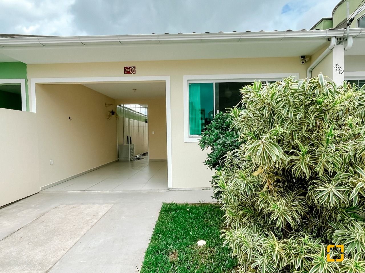 O imóvel possui 3 dormitórios, 2 banheiros, sala e cozinha integradas de forma moderna e funcional, área de serviço, garagem coberta e pátio ao redor com jardim e gramado.