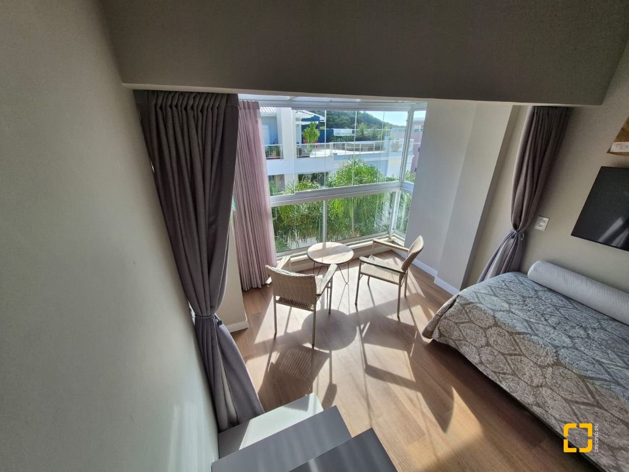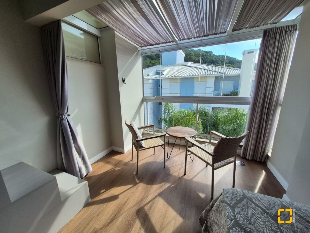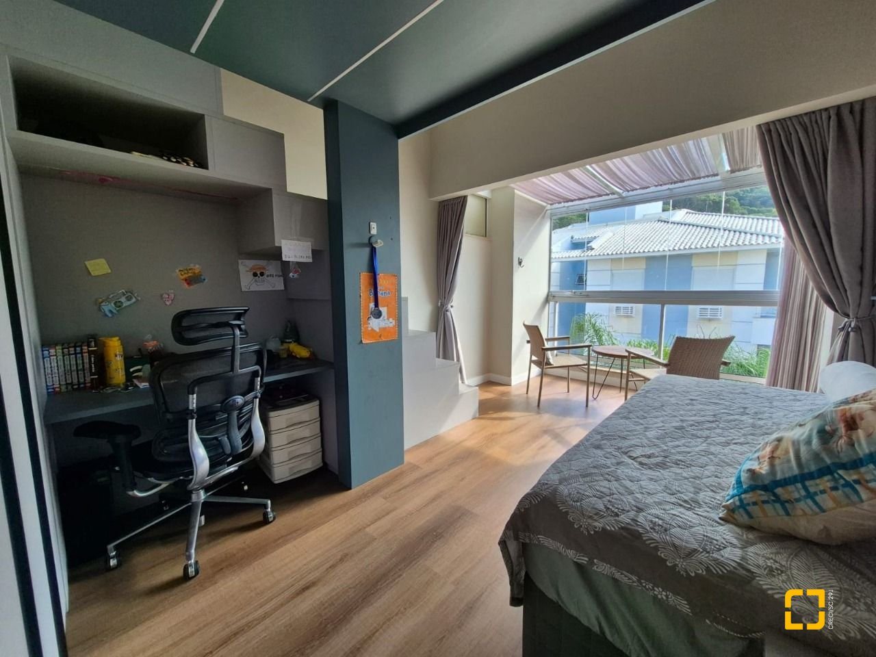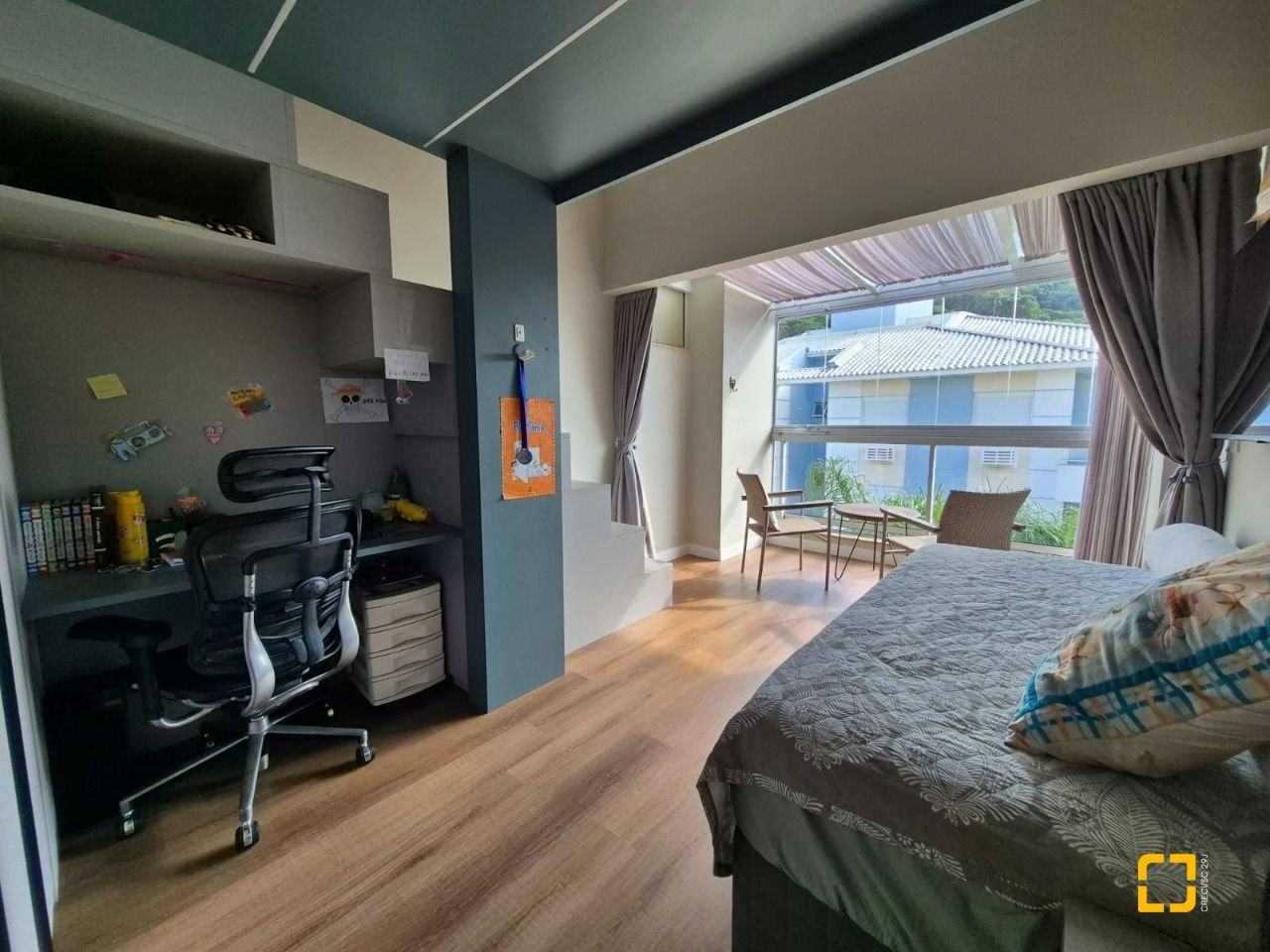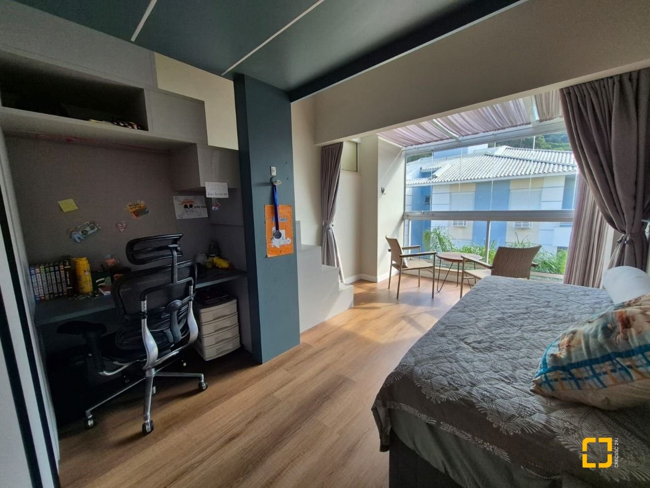 Quarto com mezanino e sacada fechada com teto de vidro e envidraçamento frontal;