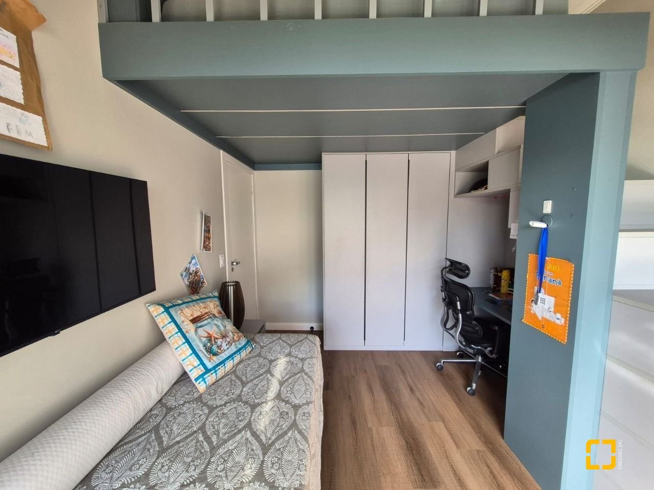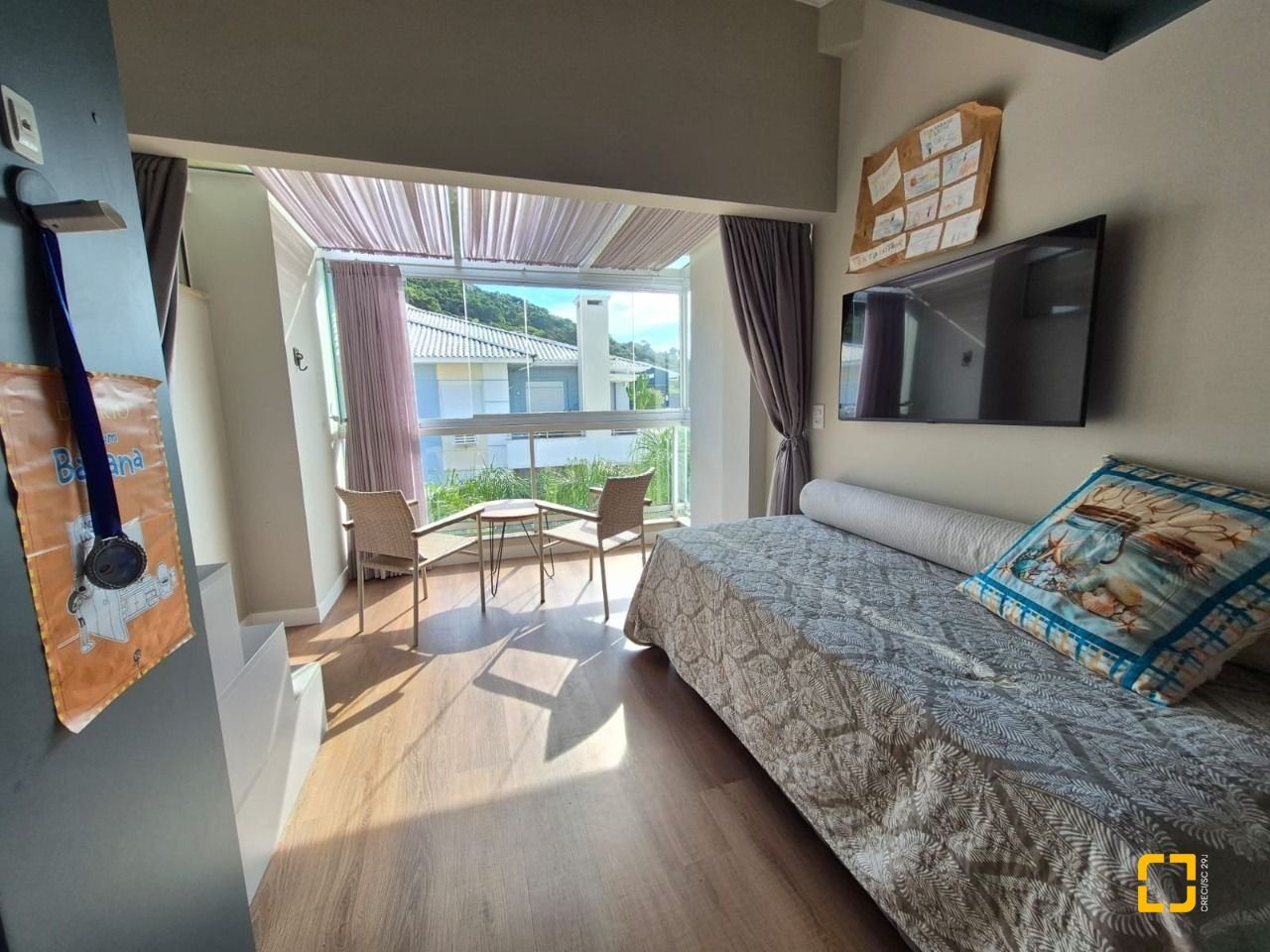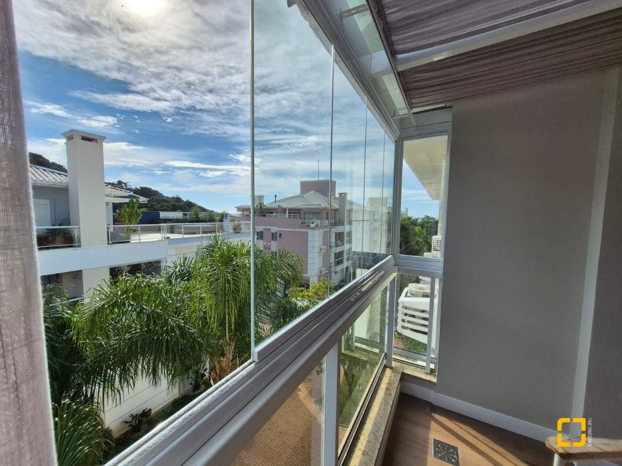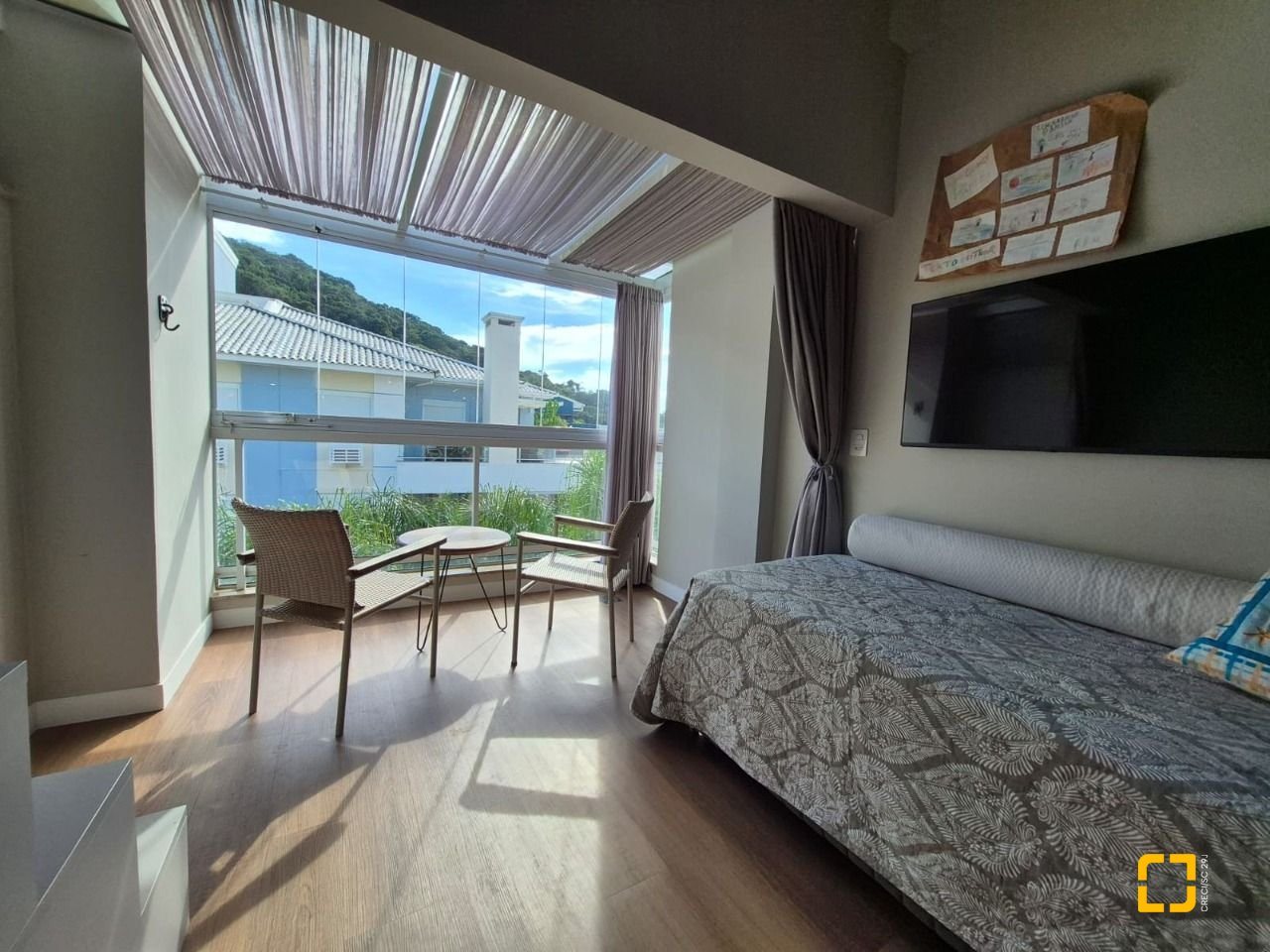 Quarto com mezanino e sacada fechada com teto de vidro e envidraçamento frontal;