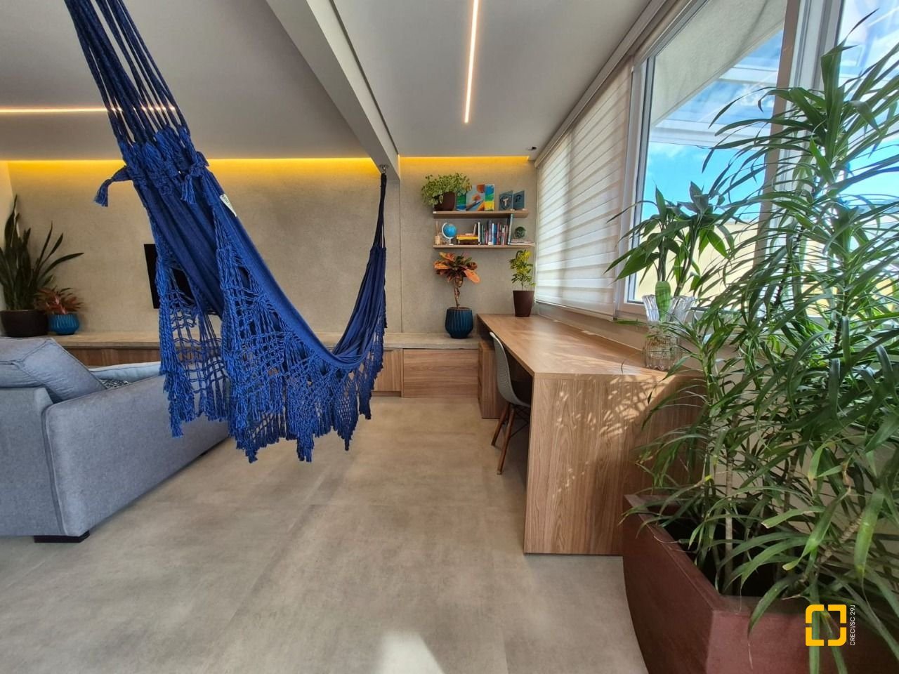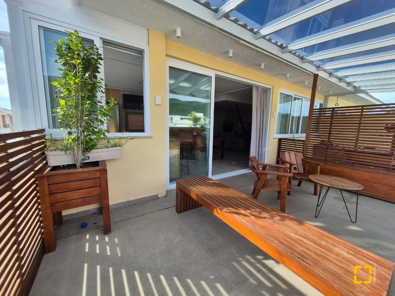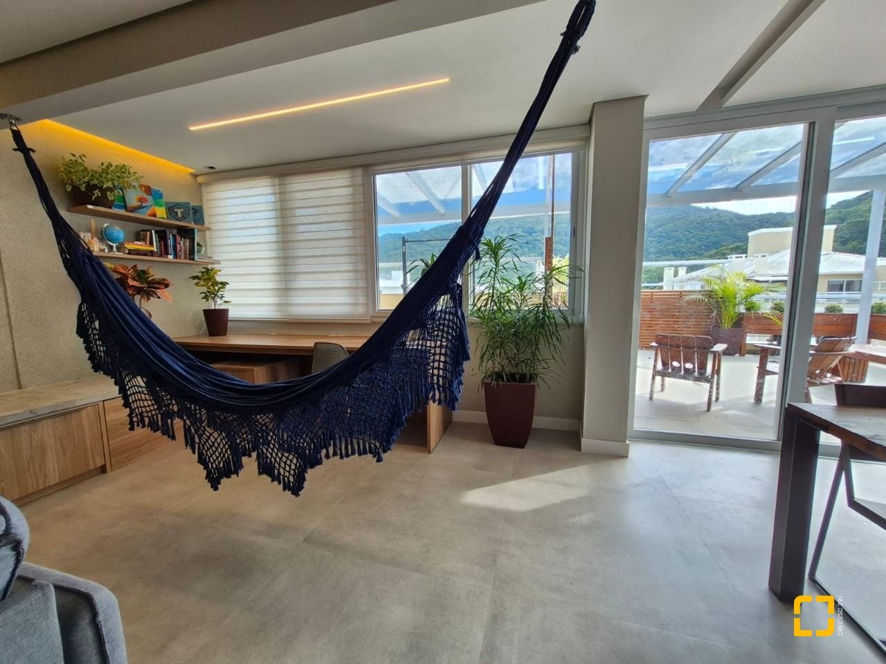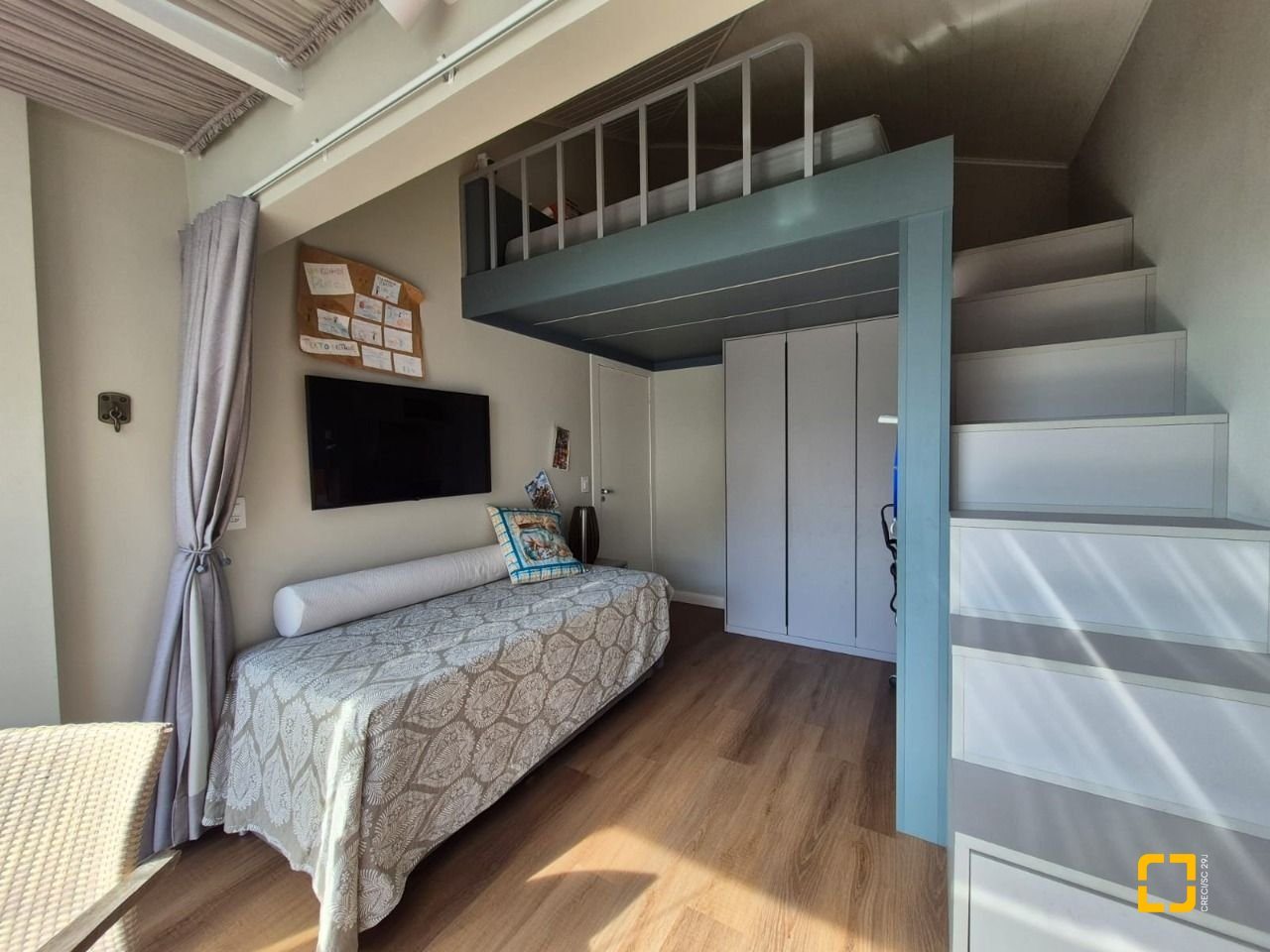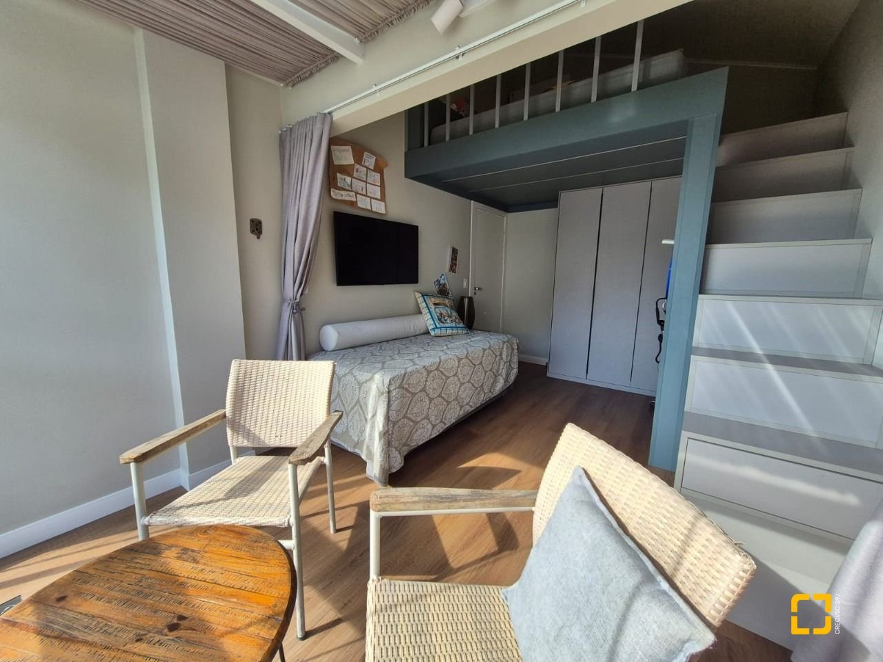 Quarto com mezanino e sacada fechada com teto de vidro e envidraçamento frontal;