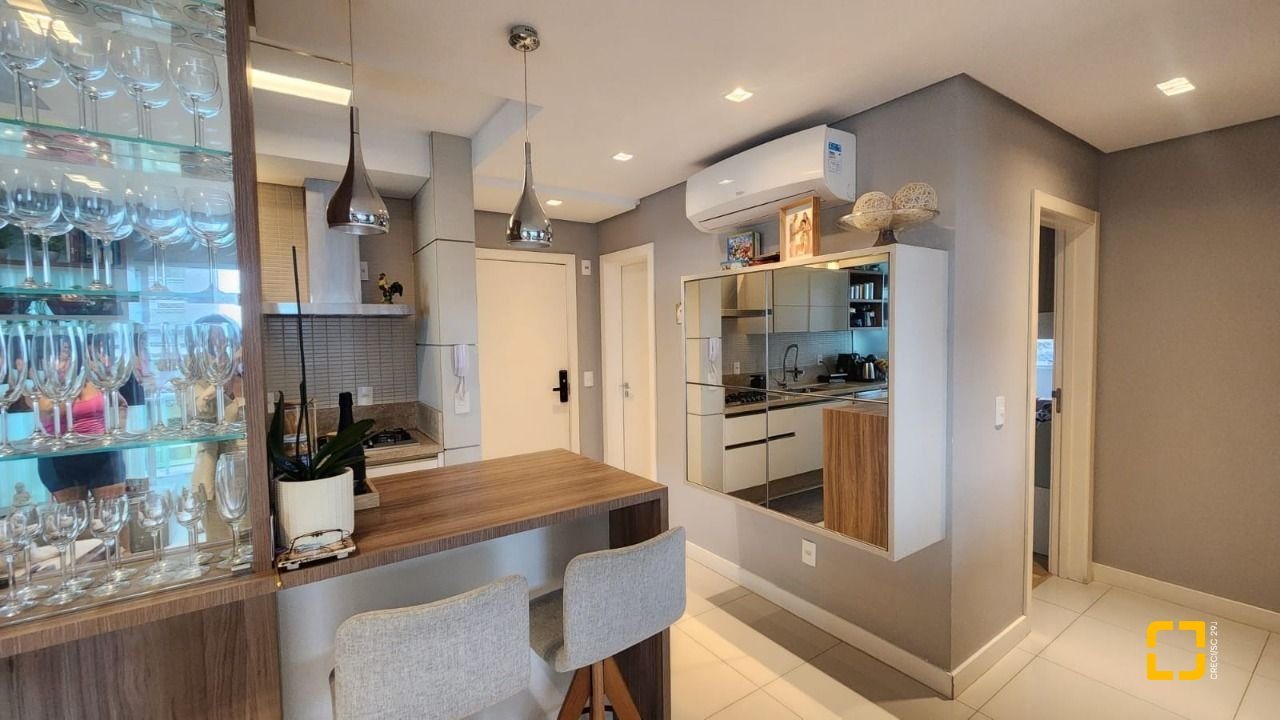 Cozinha e sala integrados com móveis planejados, lavabo, e uma bela sacada para admirar à vista e relaxar.