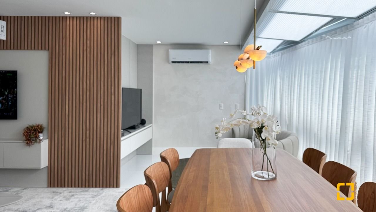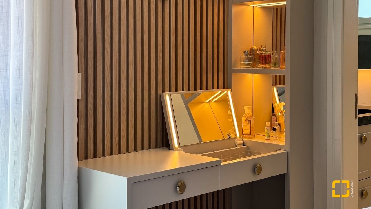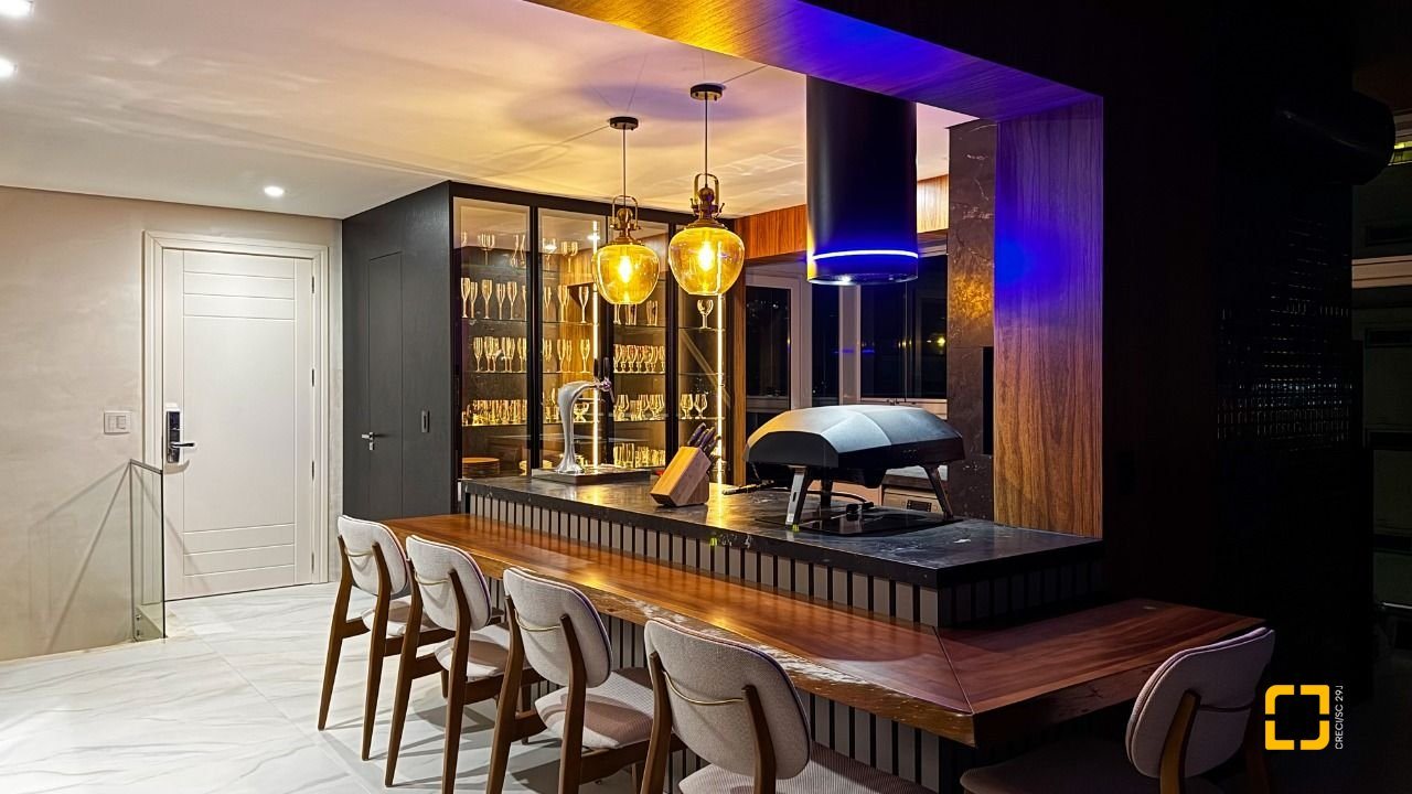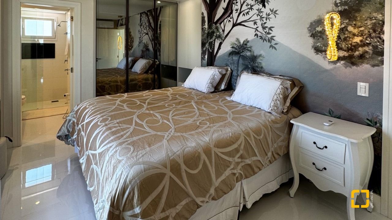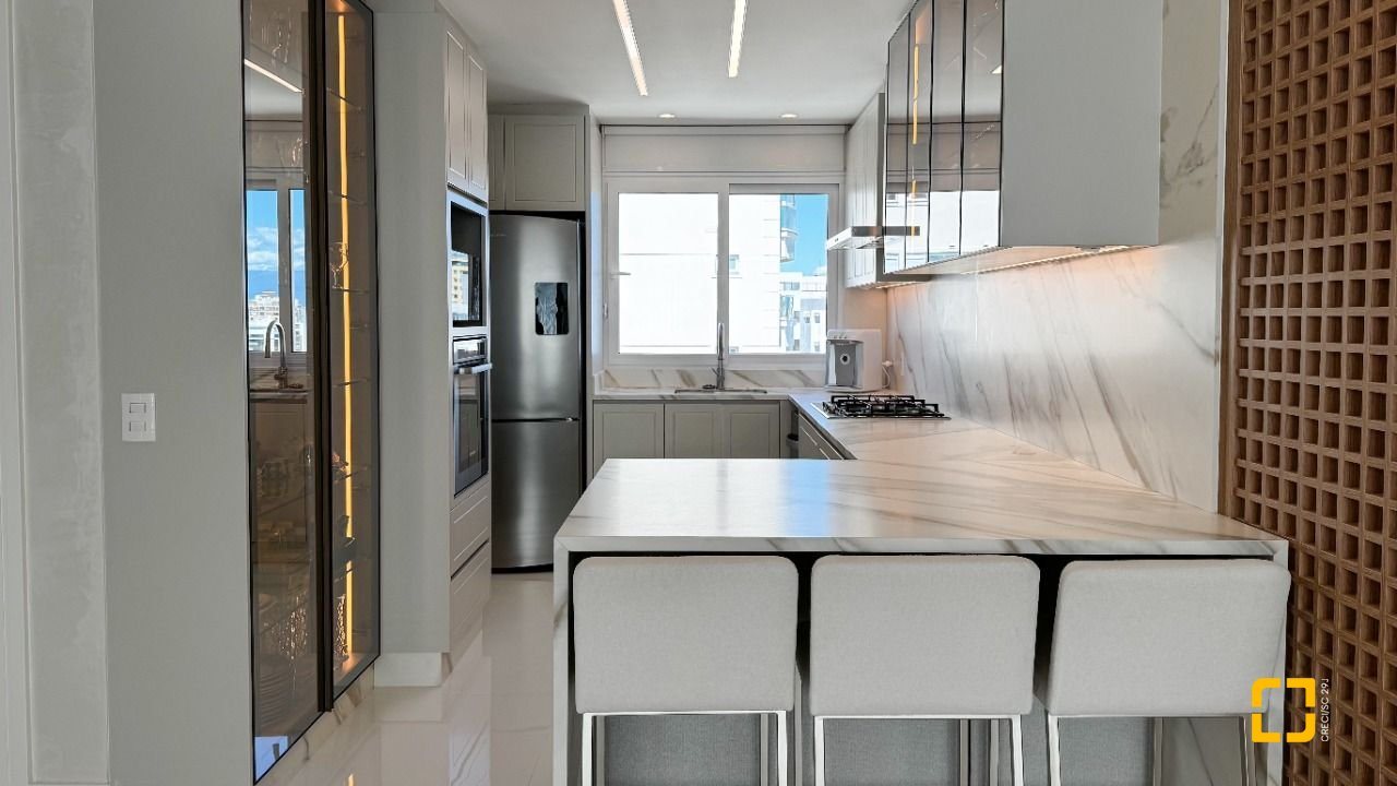 A cozinha planejada com armários, aliada à área de serviço independente e despensa, garante praticidade no dia a dia. O imóvel possui piso em porcelanato, persianas e vidros duplos nos dormitórios, além de aquecimento de água por aquecedor de passagem, preparação para automação residencial e ar-condicionado split em todos os ambientes. Permanece mobiliado com armários nas suítes, cozinha, banheiros e área de serviço.
