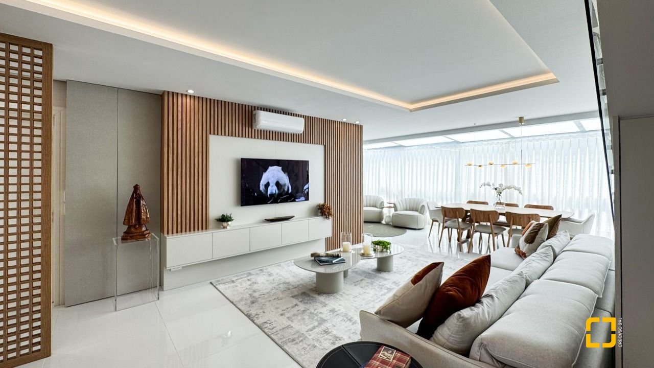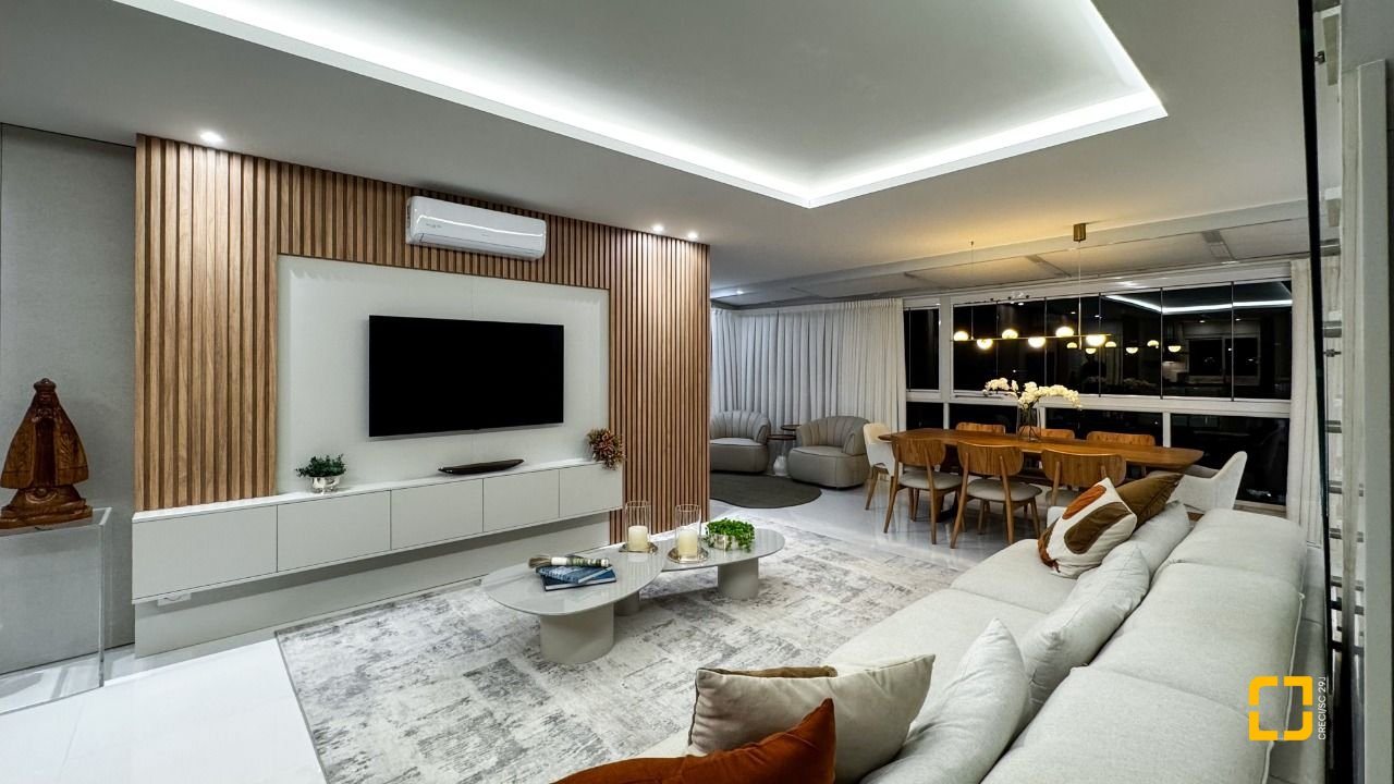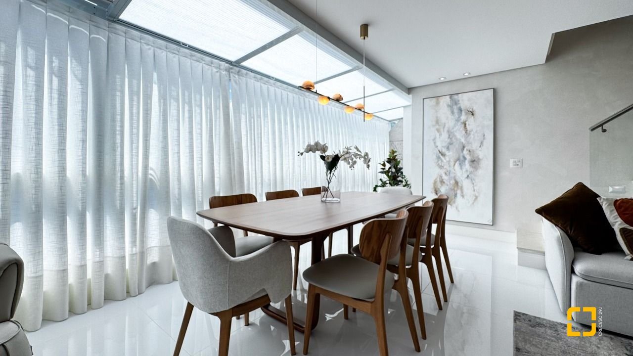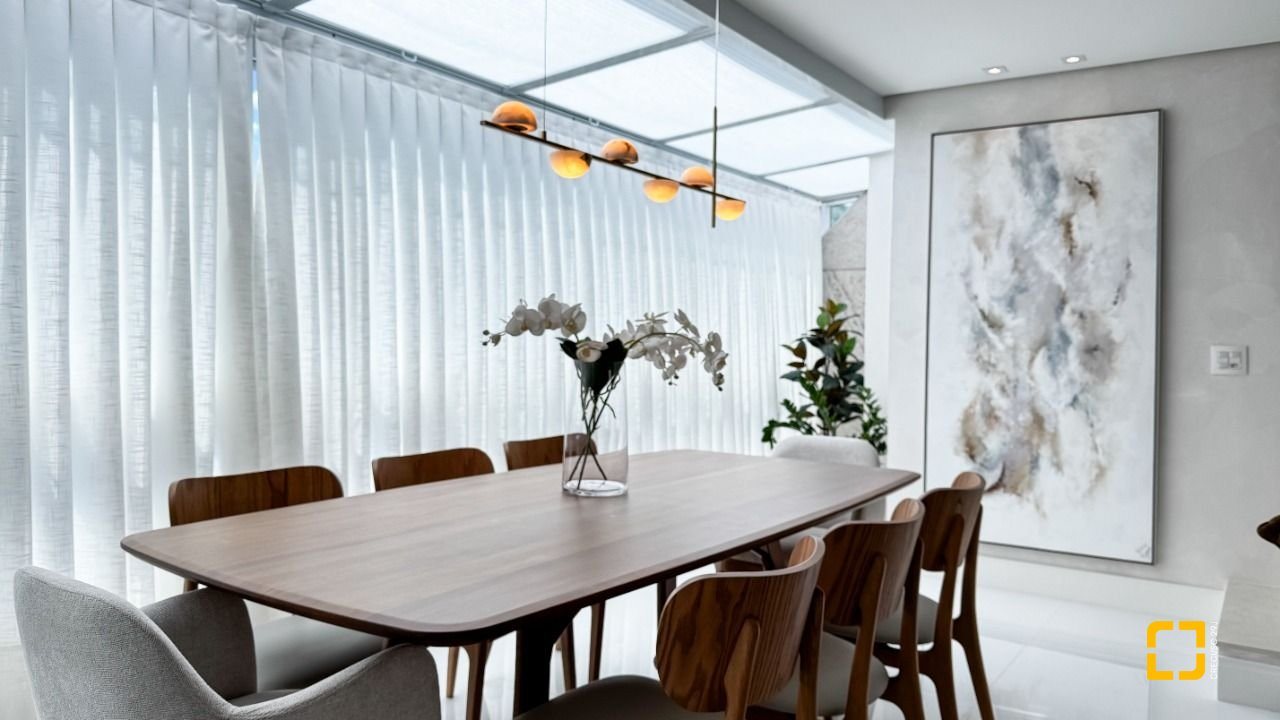 Com 244,32m² de área privativa, o imóvel conta com três suítes, seis banheiros, três vagas de garagem e hobby box, oferecendo espaço e funcionalidade para toda a família. O living com sala para dois ambientes proporciona integração entre estar e jantar, criando um ambiente acolhedor para convivência e recepção.