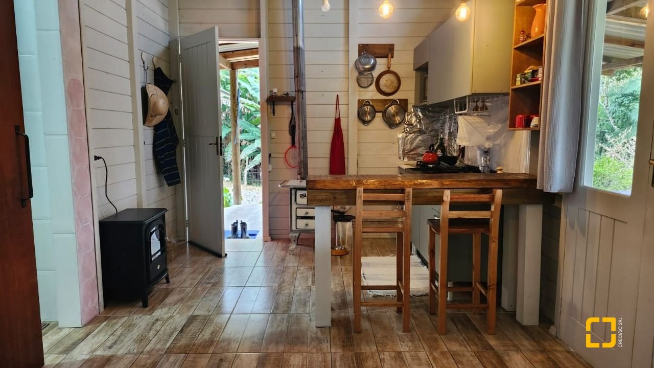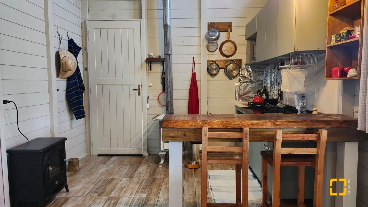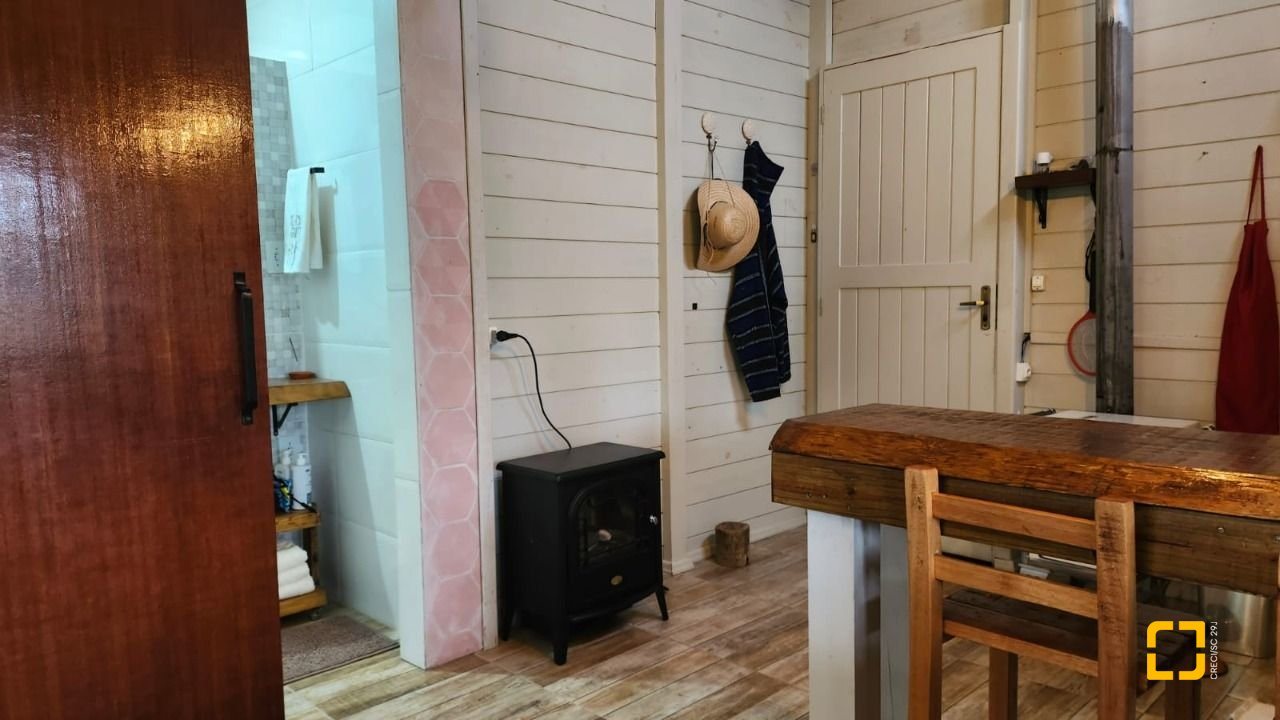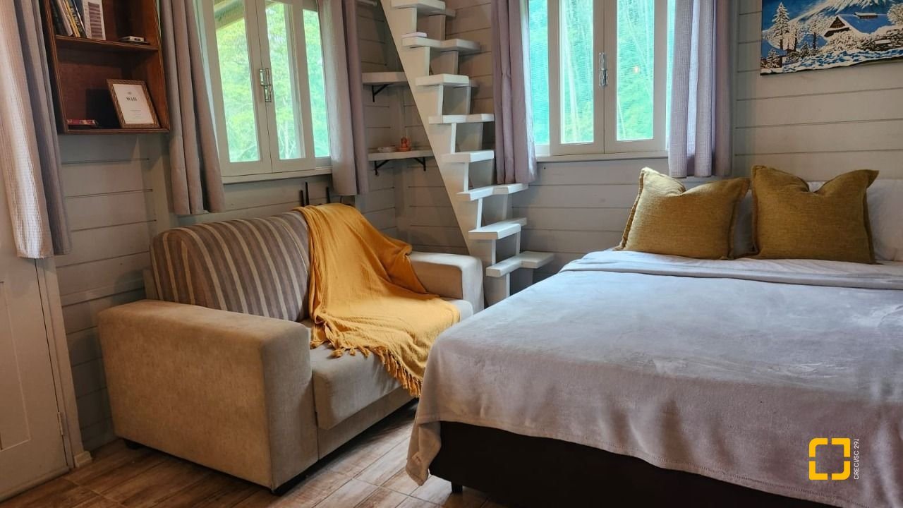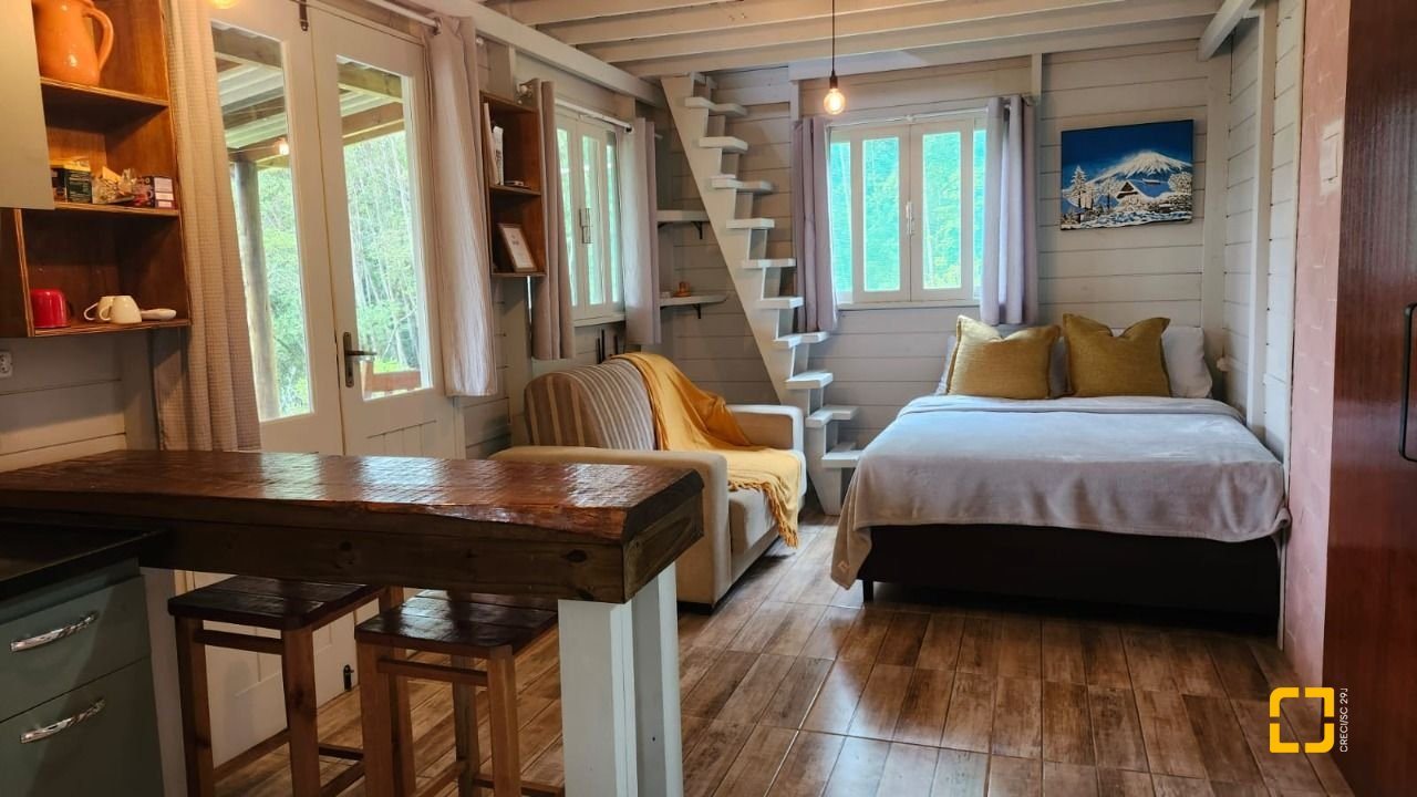 UMA CABANA DE MADEIRA COM 1 DORMITÓRIO NO MEZANINO, BANHEIRO, SALA E COZINHA INTEGRADAS E VARANDA ESPAÇOSA. COM 78M2 DE ÁREA CONSTRUÍDA.