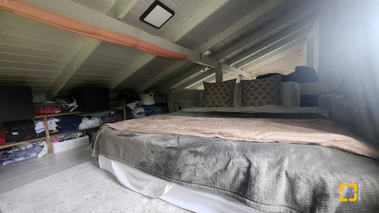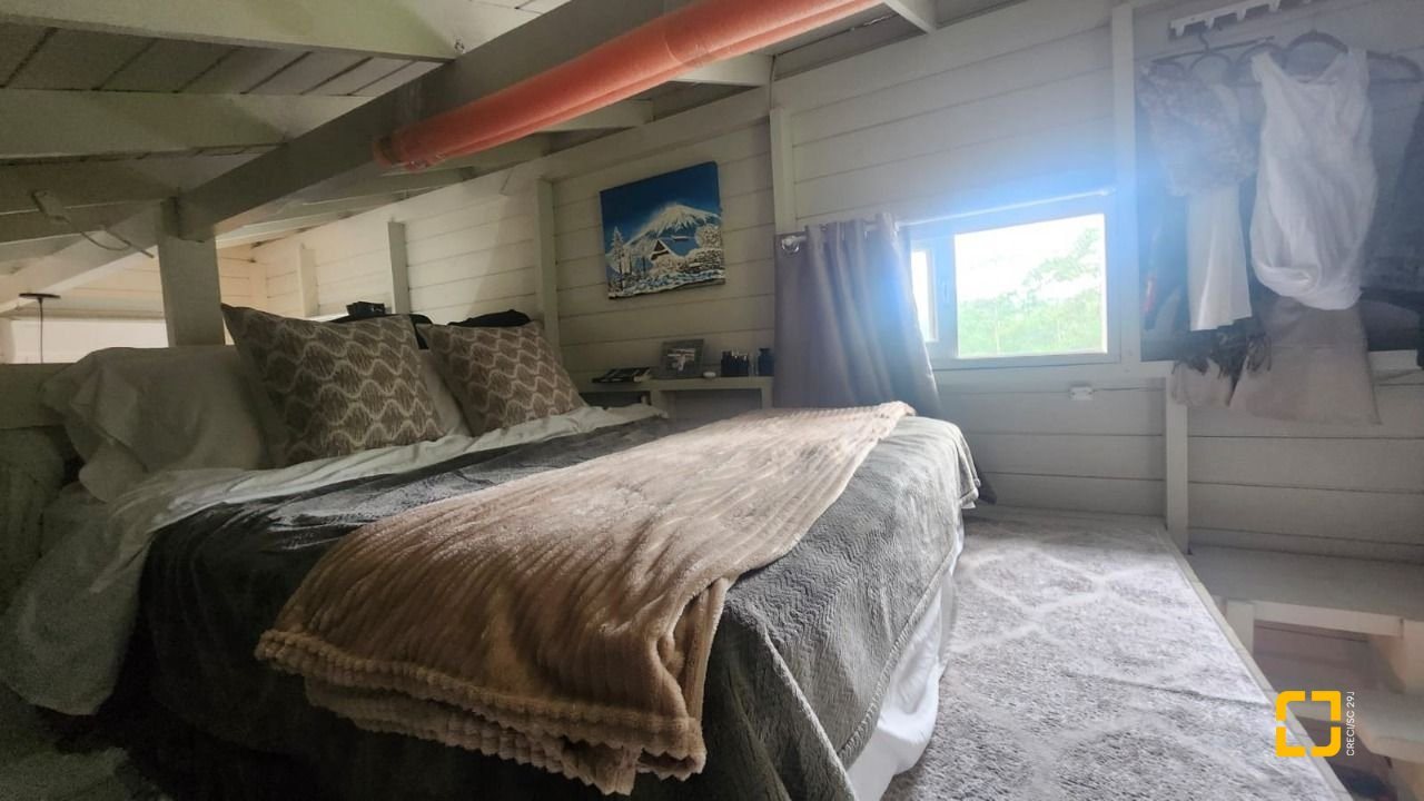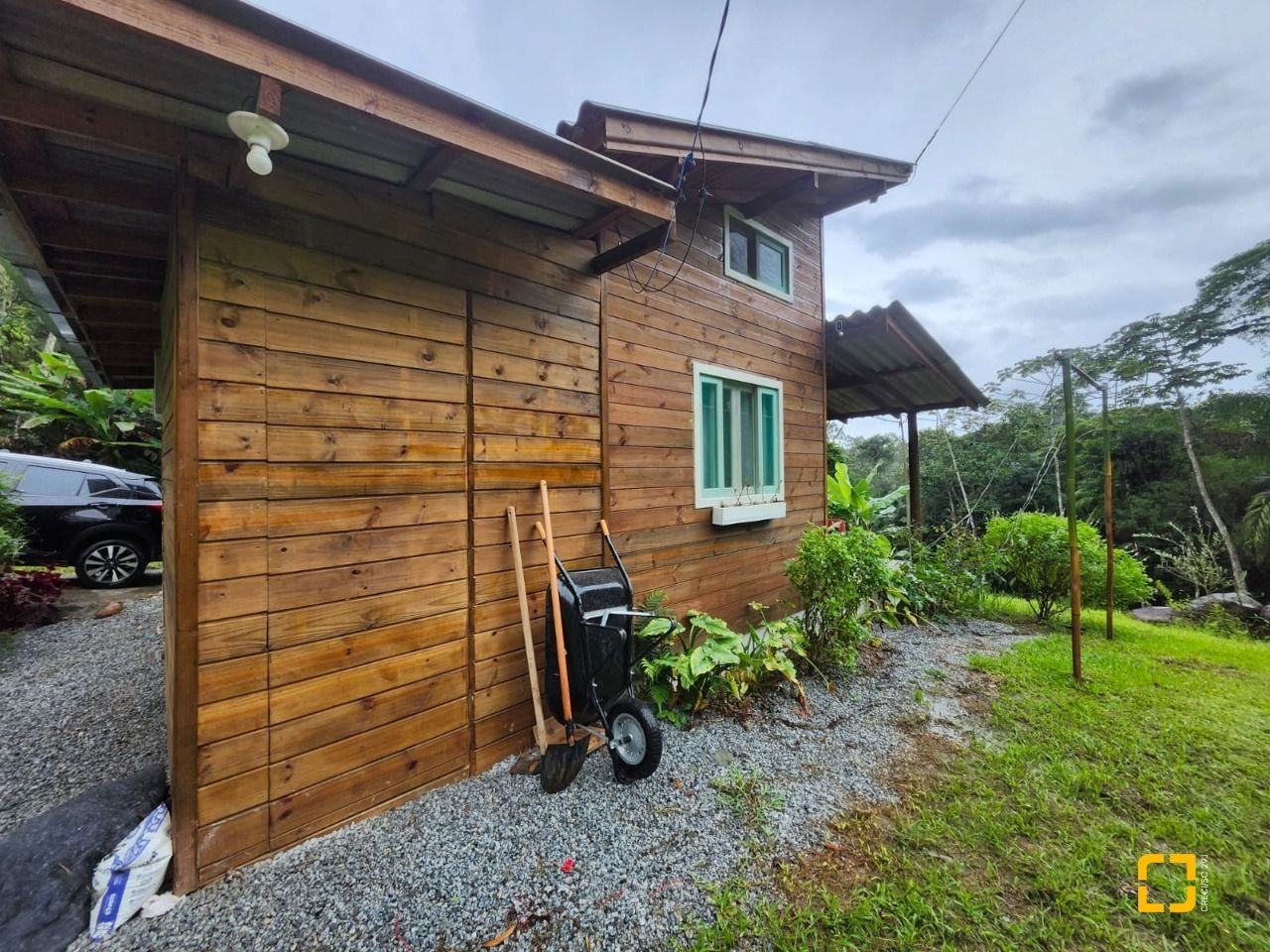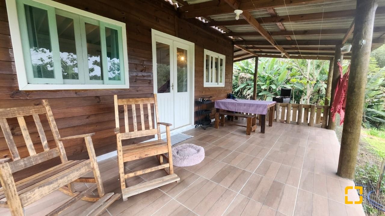 UMA CABANA DE MADEIRA COM 1 DORMITÓRIO NO MEZANINO, BANHEIRO, SALA E COZINHA INTEGRADAS E VARANDA ESPAÇOSA. COM 78M2 DE ÁREA CONSTRUÍDA.