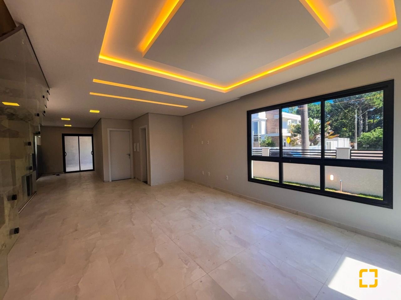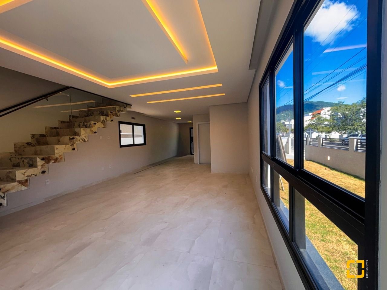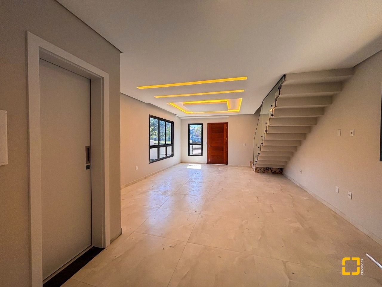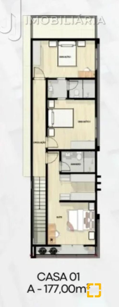 Com 177 m² de área construída, o imóvel dispõe de três dormitórios, sendo uma suíte com closet e duas demi-suítes, além de sala de estar e jantar integradas, cozinha funcional, lavabo, lavanderia e duas vagas de garagem cobertas.