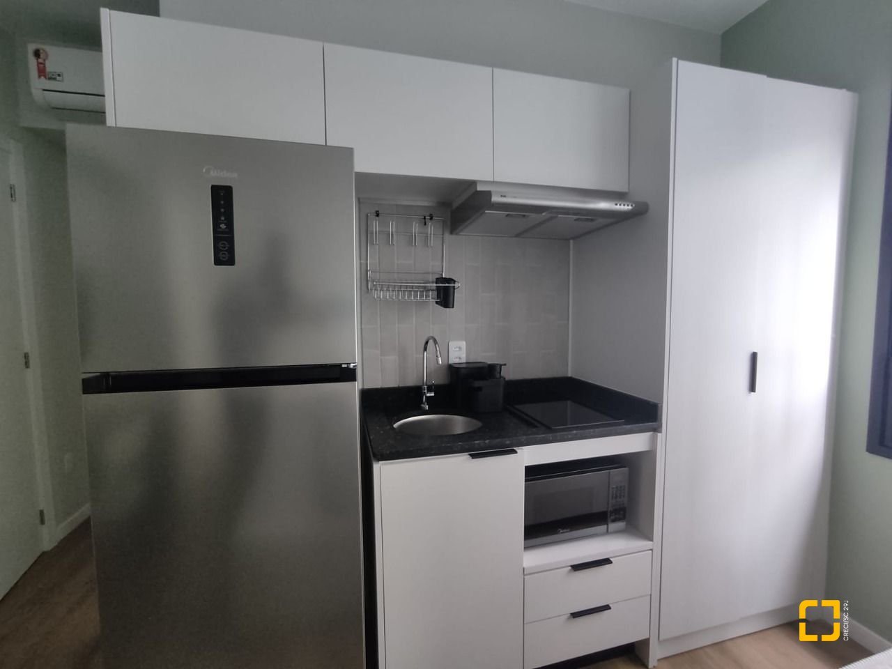- Mobiília completa (cama box baú, sofá, bancada com cadeira, armários planejados, geladeira, fogão de indução, exaustor e ar-condicionado.